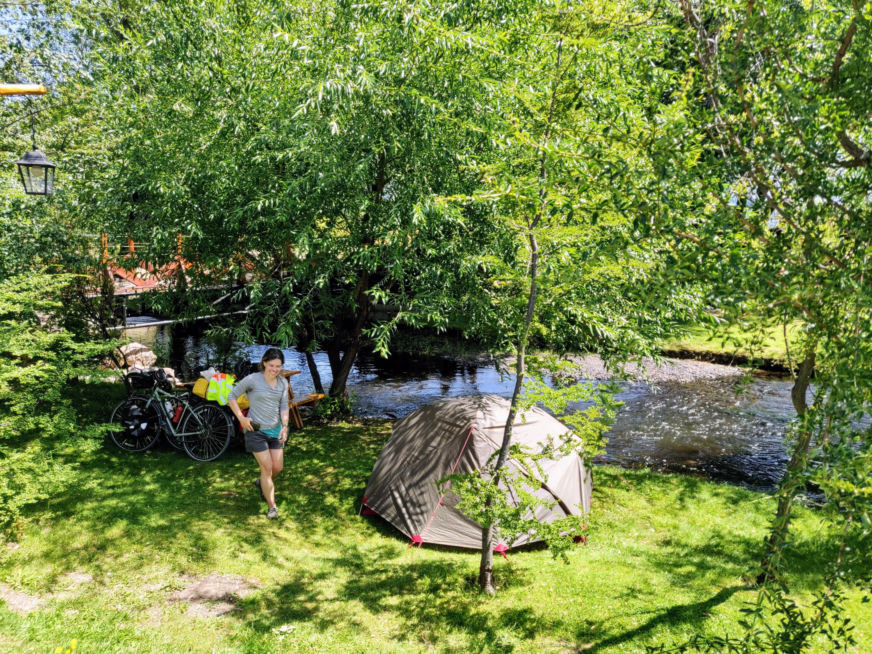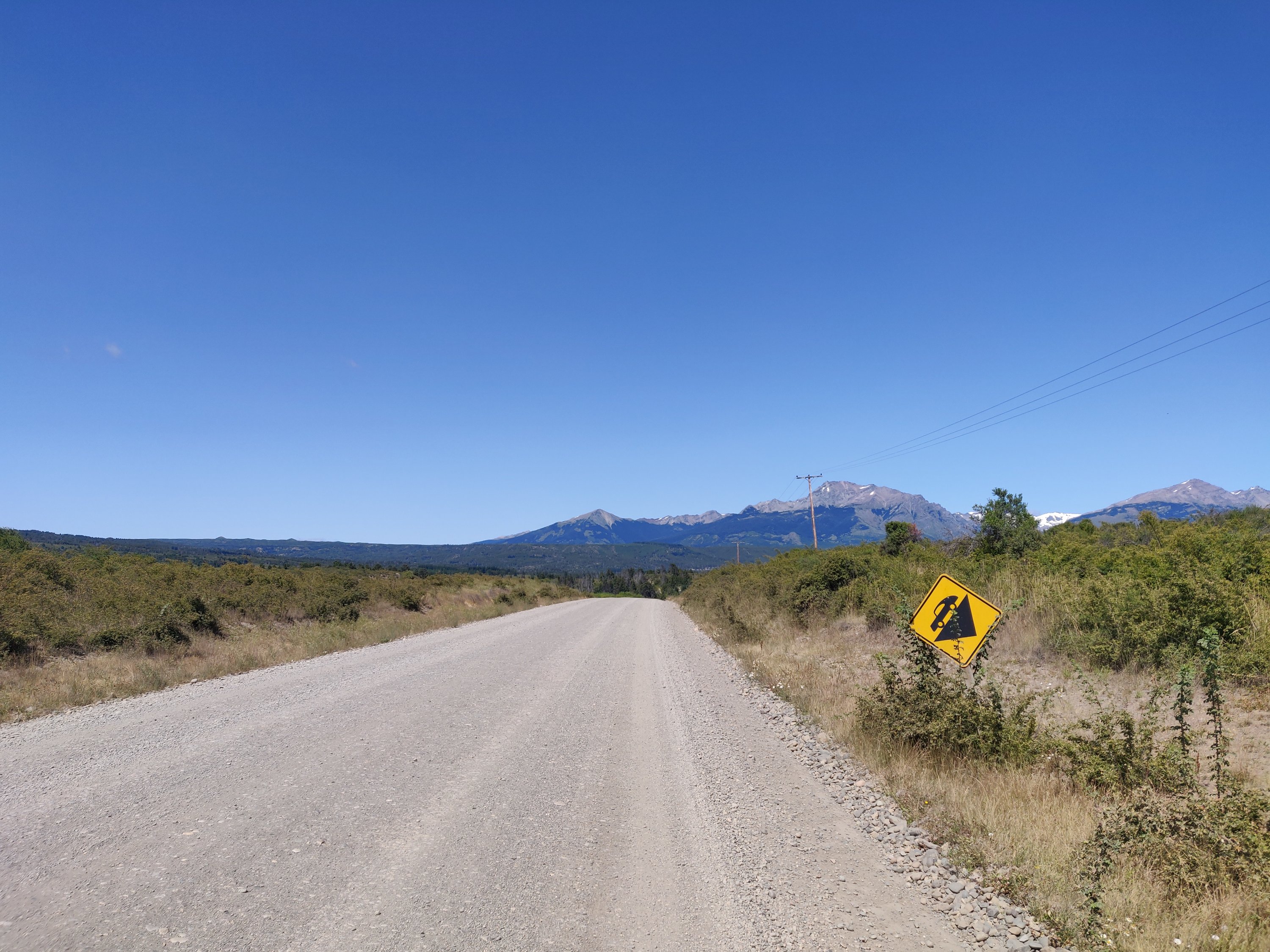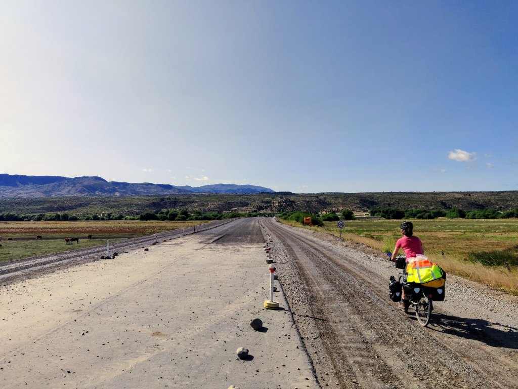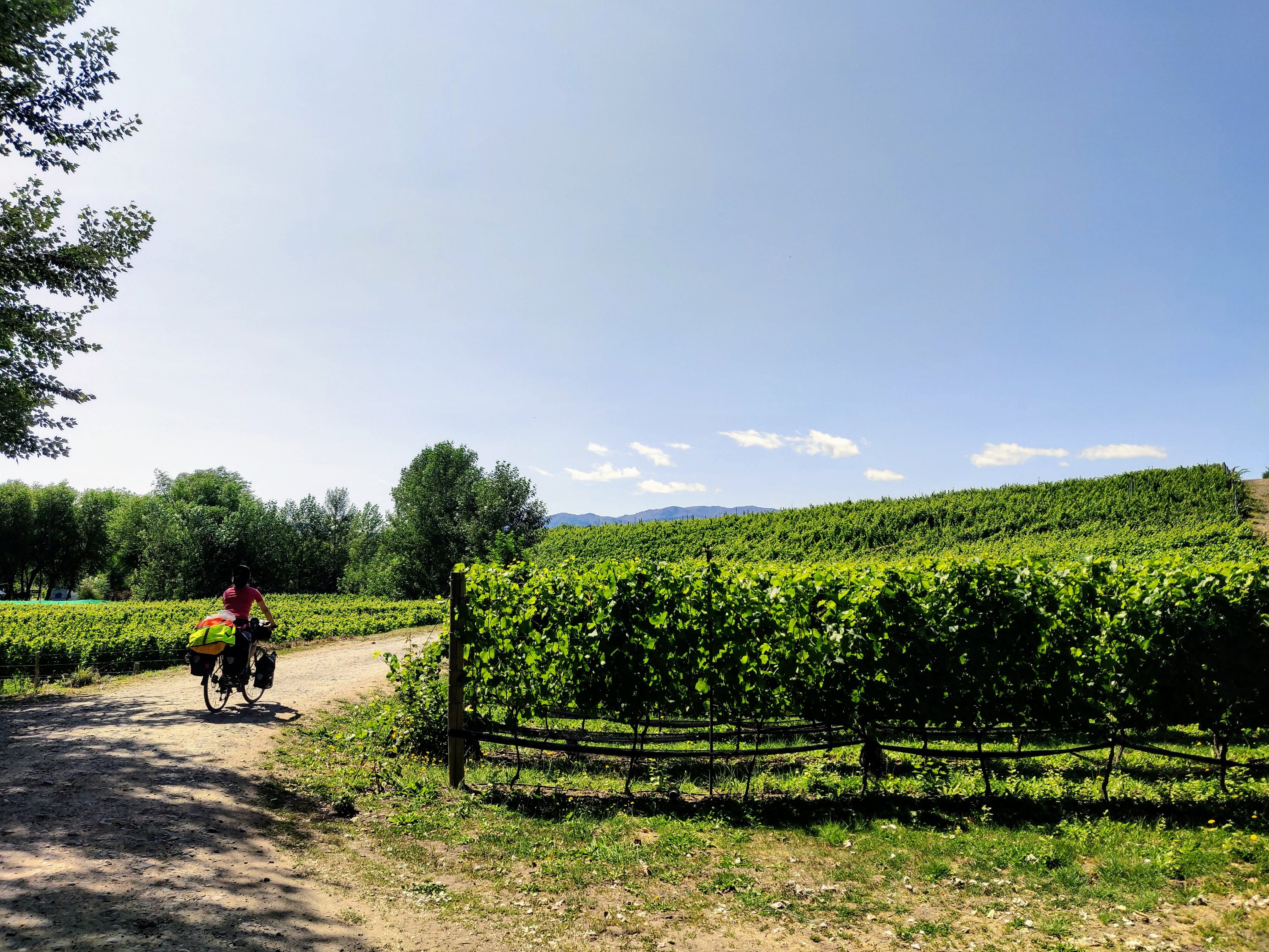 On Sunday 26th January it was time to move on, and we hit the road south to start tackling the infamous border crossing ripio. Paved road was short-lived and soon we were slipping and sliding around on loose gravel surrounded by big blue skies. The going was no worse than Los Alerces and we made it to Nant y Fall stream by lunchtime, with signs for the vineyard of the same name. We cycled down past rows of vines and to the vineyard campsite. We were told it was fine to stay for lunch but on looking around at the little stream and idyllic pitches, seeing people tasting wine and smelling lamb roasting, feeling the heat growing and headwind strengthening, it took no time to decide to stay for the night.
