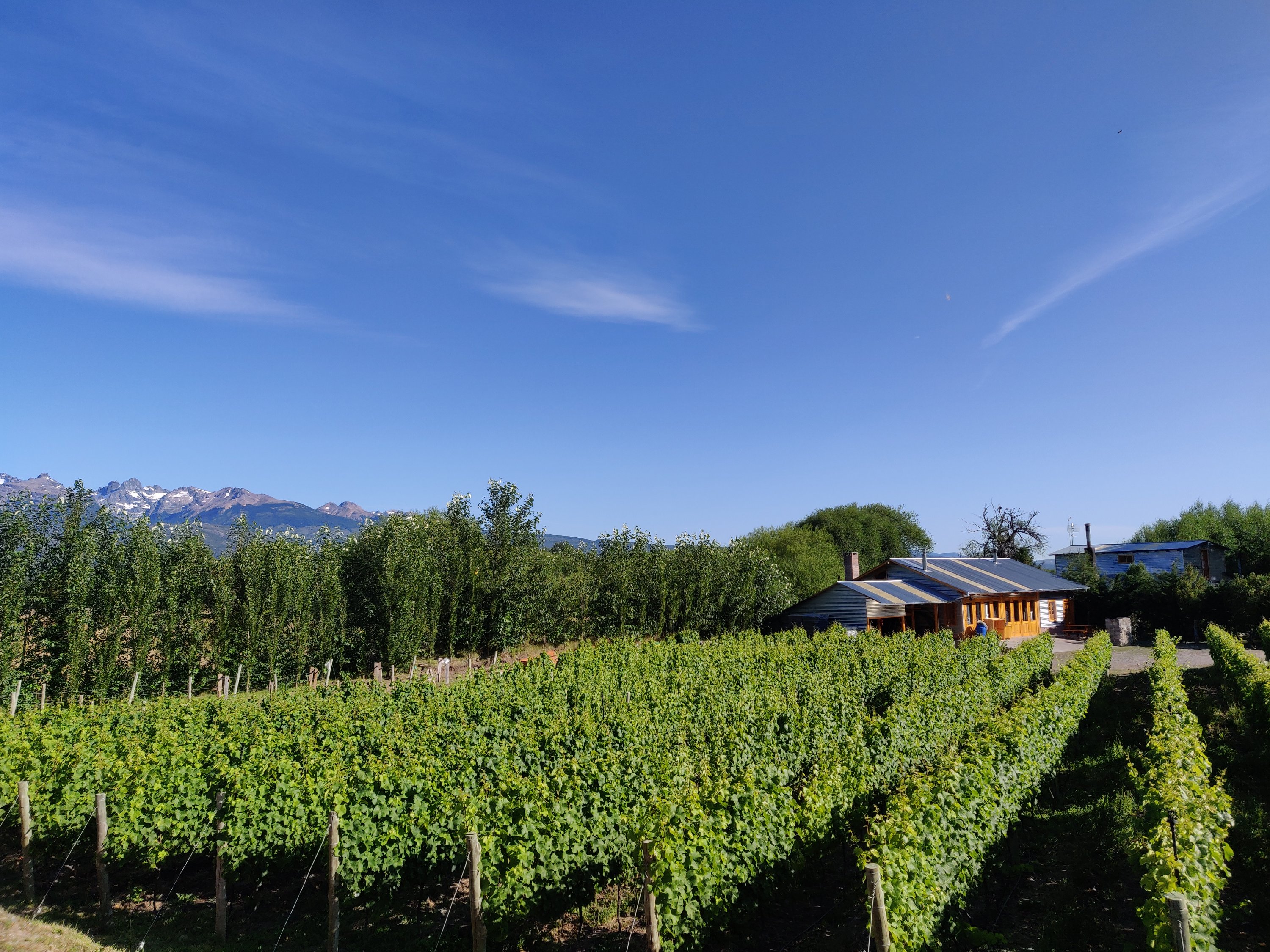 The vineyard was run by a family of Italian origin, who bought the land before knowing what to do with it. After removing thick cover of wild roses, they initially tried using the stream for hydroponic fish farming, a common practice locally. But their dream was to make wine, a family tradition near Venice in Italy. The north facing slopes and well draining soil proved ideal conditions and they planted Pinot Noir and Riesling grapes with success. The biggest challenge is the frost, which at the most southerly vineyard in the world can happen at any time of year, even mid summer. To cope with this, they use very clever irrigating protection which is triggered any time the temperature drops. The water freezes on the grapes but can’t drop any further below freezing so protects them from harder frost. The occasional freezing makes the wine very unique with a deep dark red colour and summer fruit tastes.