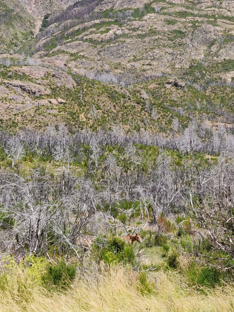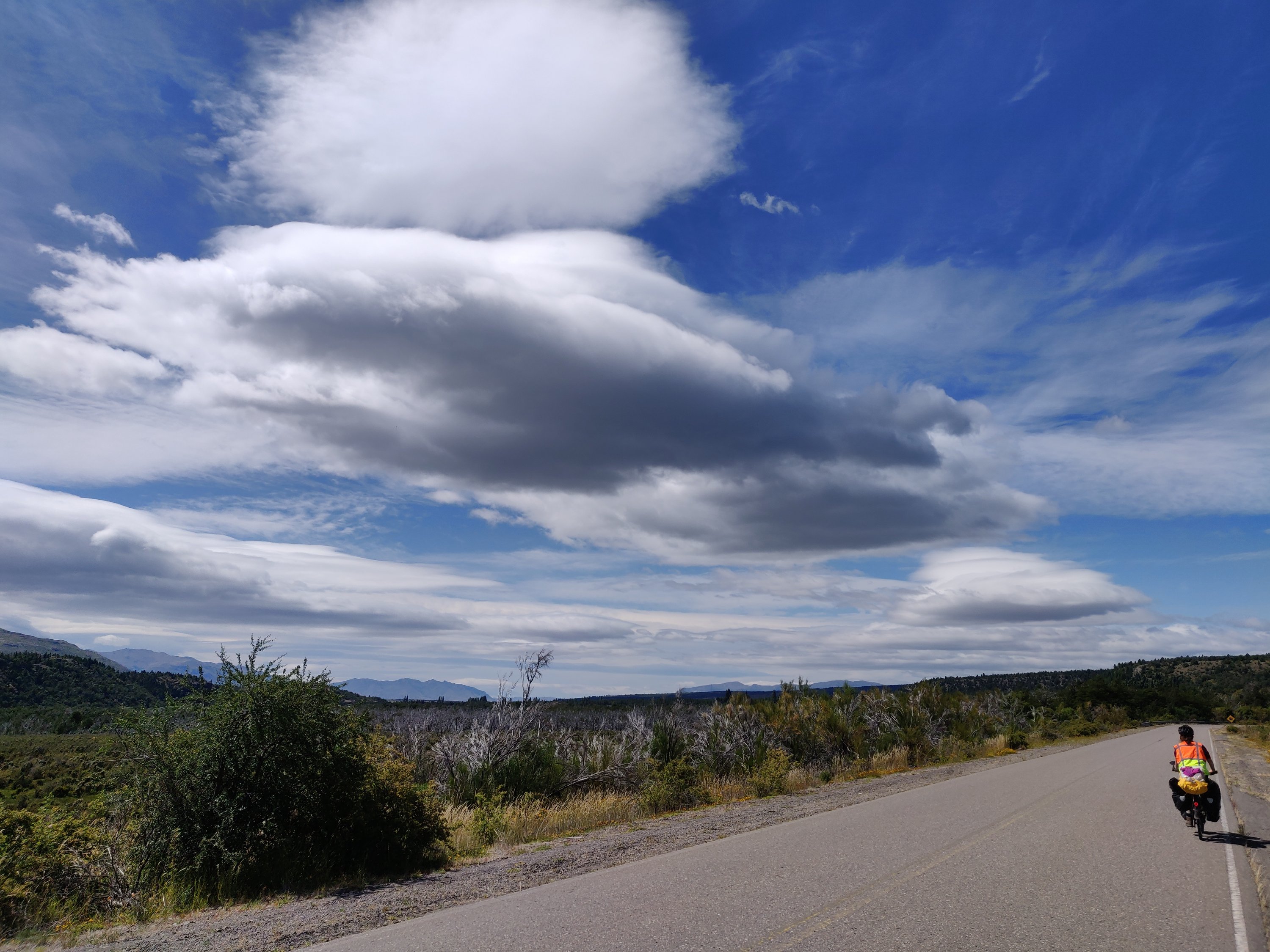 On Friday morning, thoroughly rested, we left camping Bahia Rosales and trundled south along the east shore of lago Futalaufken, soon back on smooth asphalt. Some strange cloud formations provided occasional shade and it was a fraction cooler than previous days, making the ride very enjoyable. We passed some acrobatic swifts by the lake and then, as the terrain opened out, hillsides covered in dead grey trees, presumably destroyed by fire. As we crossed the southern boundary of the national park, we looked back to see the forest fire risk marked severe, somewhat unsettling on a bike.