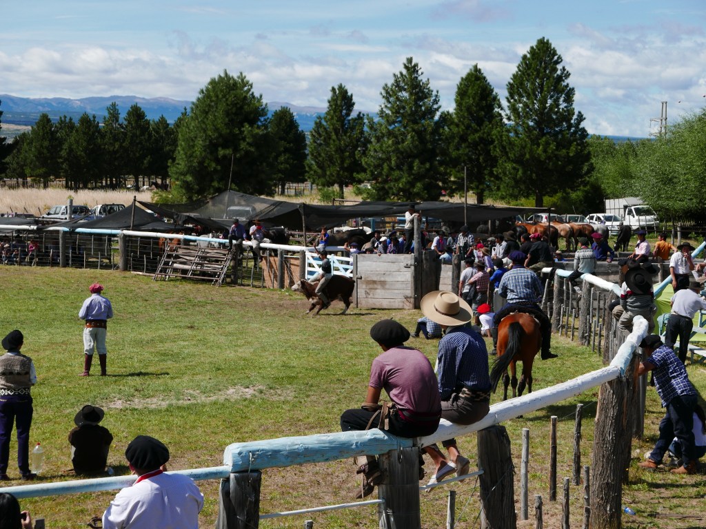 Saturday was a new day and we were excited to see what the Ternero Cordillerano was all about. After successfully swapping the torta negra for a fresh one, we headed out west of town to the outdoor arena consisting of a football pitch-sized area of grass surrounded by fencing, a couple of small stands and a pavilion hosting a live band playing Argentinian guitar music over a loudspeaker. Three children were trotting around the arena on horseback with a commentator making continuous announcements in Spanish. It was somewhat underwhelming, but then we noticed a pen full of bullocks at one end and wild looking horses at the other. Hundreds of people were wandering around in gaucho dress, quite a few on horseback too.