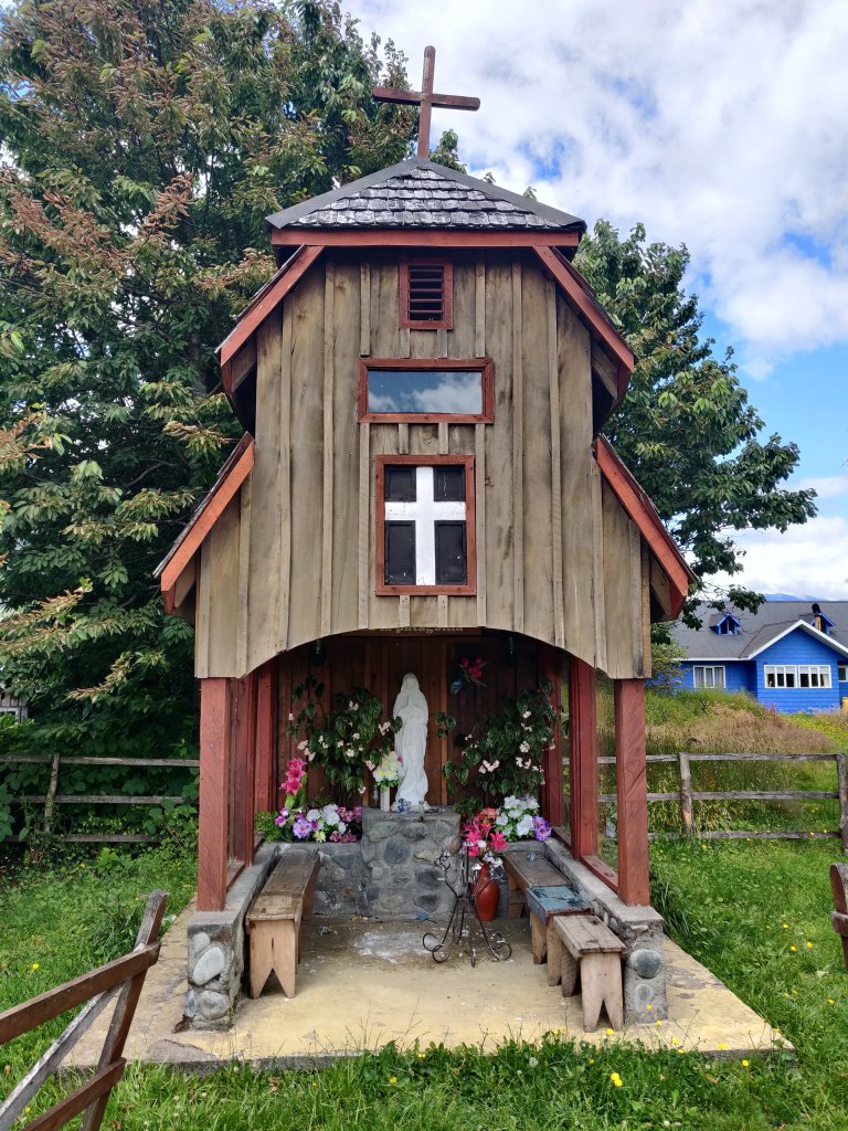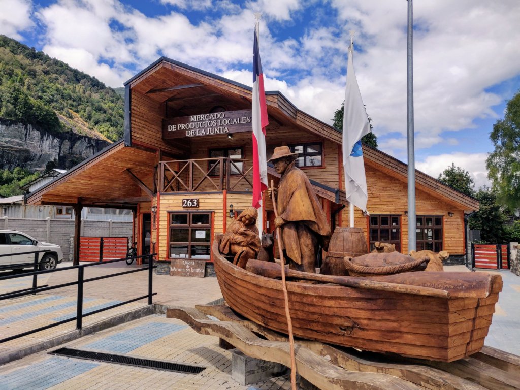 From Los Avellanos camping it was an easy 4 km to La Junta, a village adjacent to the Carretera, where we stopped for lunch supplies and a quick look around. One guidebook dismissed it as little more than a service station, which was very unfair. We saw lots of colourful wood shingle cottages with tidy front flower gardens, a library and local produce market building with carved wooden boat outside.