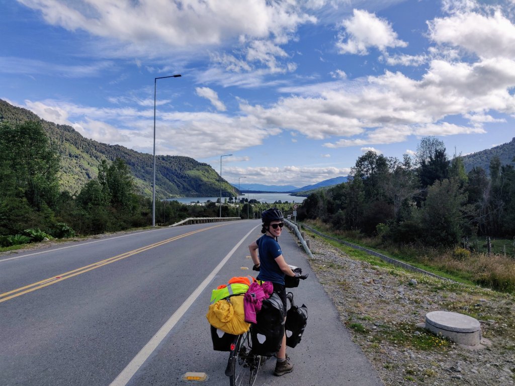 Soon we arrived at Lago Risopatron, and 10km of ripio gravel. We stopped to refill water from a stream and then battled continuous ups and downs, our legs still aching from yesterday. Finally we arrived at the end of the lake and what appeared to be the start of a long descent to Puyuhuapi. Unfortunately, Robbie pronounced as much just before a bend showed the steepest climb of the day. Hannah was not amused. Finally we did start rattling downhill, until the town appeared in the distance and our first view of the sea: a long inlet, the Puyuhuapi Canal, which eventually joined with the Pacific Ocean. After a quick photo and very excited, Robbie set off around Hannah and clipped rear panniers, sending Hannah’s saddle straight into the small of her back very painfully. It was a subdued ride down into town.