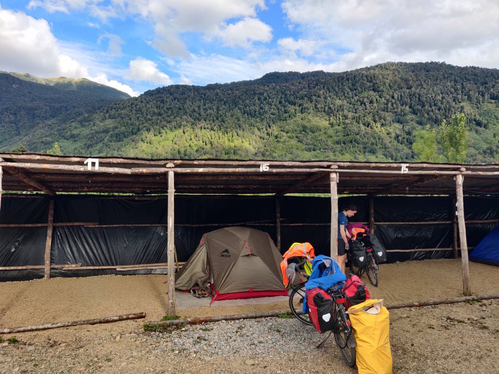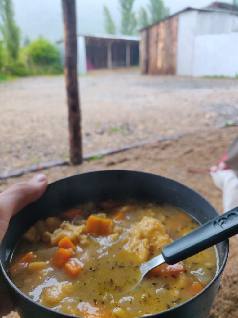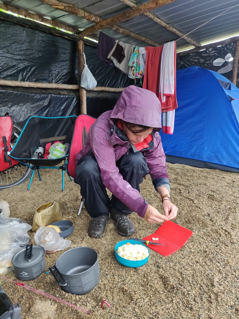 On Saturday, we knew to expect torrential rain from late morning and so had booked ourselves in to a guesthouse which we hoped would provide somewhere warm and dry in case we ended up soaked. In fact the car port was remarkably water tight and the monsoonal rain only lightly dusted our outer tent on one side. Hannah experimented with various dishes from the camping cuisine guide she had found online whilst Robbie wrote some blog entries. We had some delicious dumpling soup for lunch and oaty peanut balls as snacks.