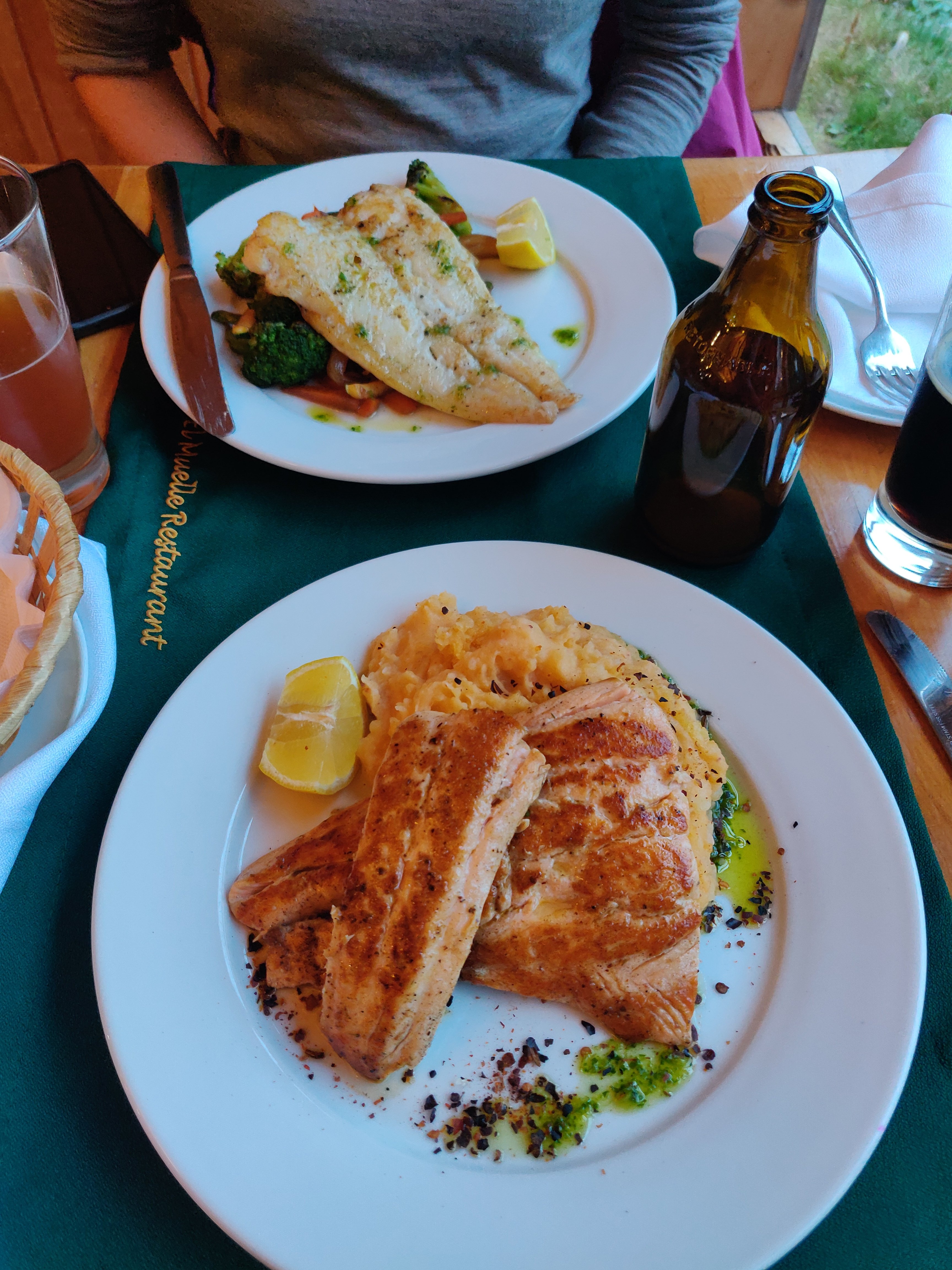 Tent pitched under the corrugated area, we went for a wander and for food. We’d heard good things about fish and came across el Muelle near the water front serving variations of salmon and meluza, a local white fish resembling hake. Ordering one of each, two enormous portions of delicious butter fried fish appeared with sautéed potatoes and stir fried veg, all washed down with some local craft beer.