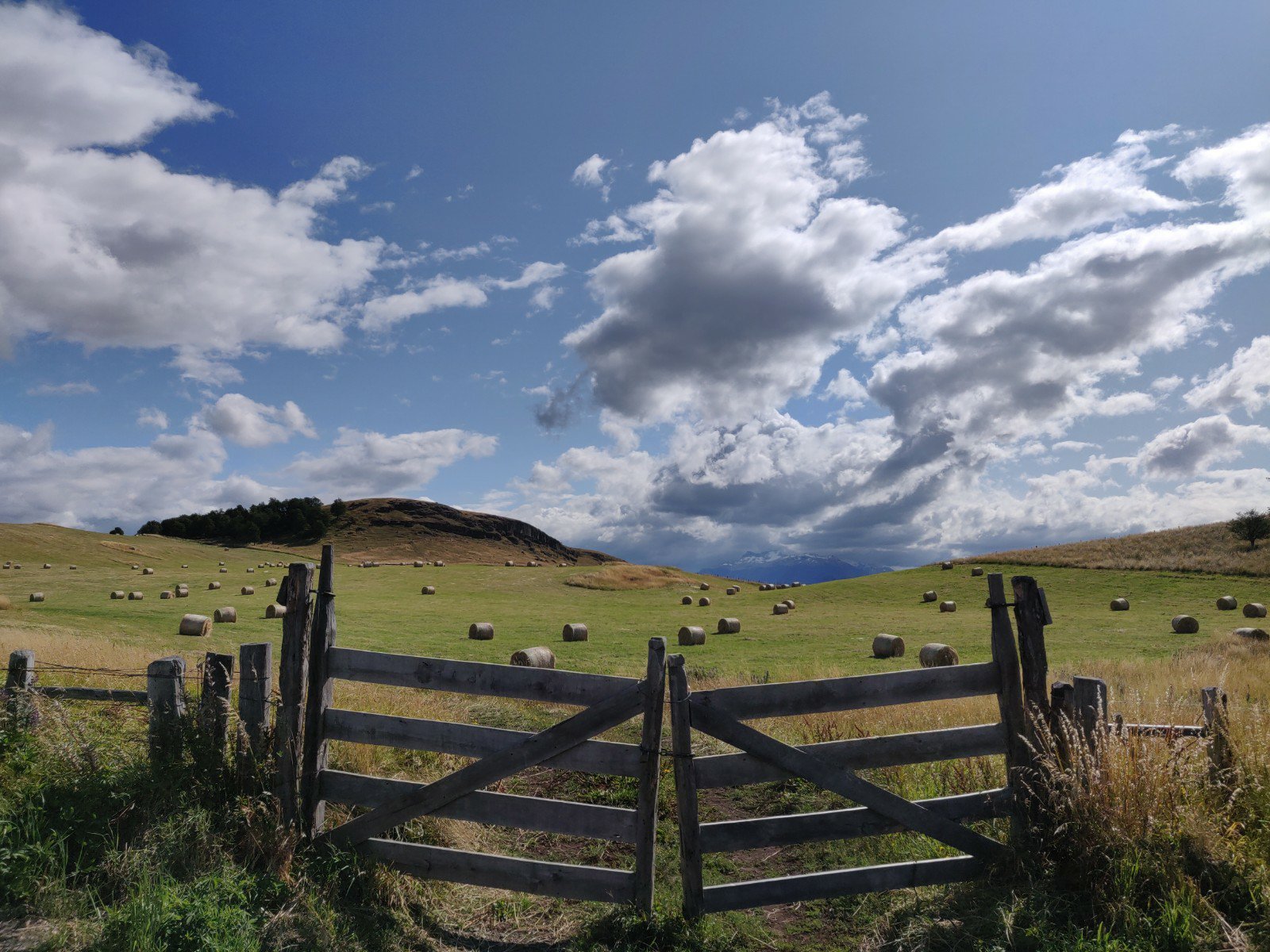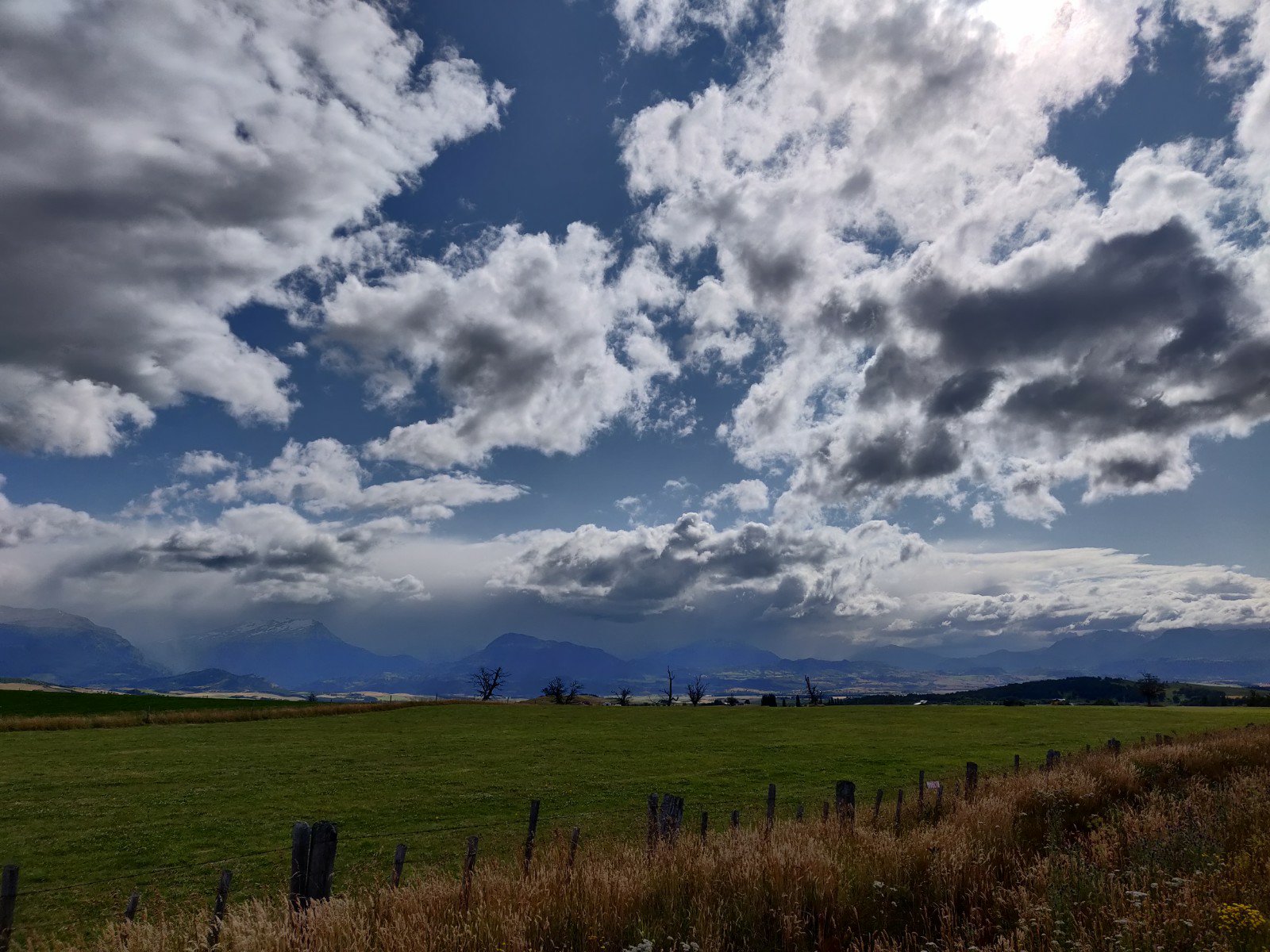 We bore southeast leaving the river temporarily and entered a landscape of rolling hills and big skies, helped along uphill by a stiff tailwind. Cumulus clouds were growing around us and a shower passed quickly. To the south we looked down on a double waterfall and some geodome lodges before turning further east. We entered another long stretch of roadworks and moved from one side of the road to the other around all sorts of machinery as traffic flowed past us in alternating directions. The tailwind grew in strength powering us up the hill but also carrying in some very black clouds and spots of rain. We quickly started descending at high speed hoping to out run the storm but at a bus shelter decided to don waterproofs in readiness.