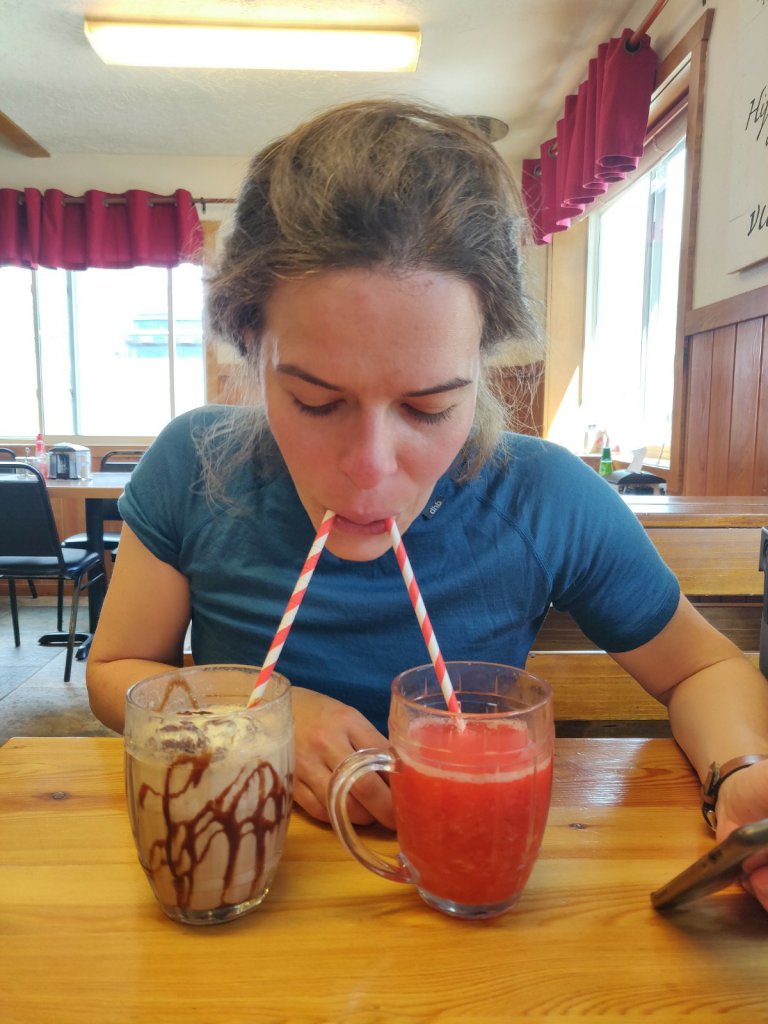 On Wednesday 12th February we had a lazy start with slightly sore heads. We loaded up our bikes in Coyhaique’s El camping, bid Richard, Jeanette and the German shepherd farewell, and had an early lunch of bread and cheese. We stumbled our bikes up the incredibly steep hill back to the Carretera and stopped at cafe peregrino for some post lunch coffee and cake.