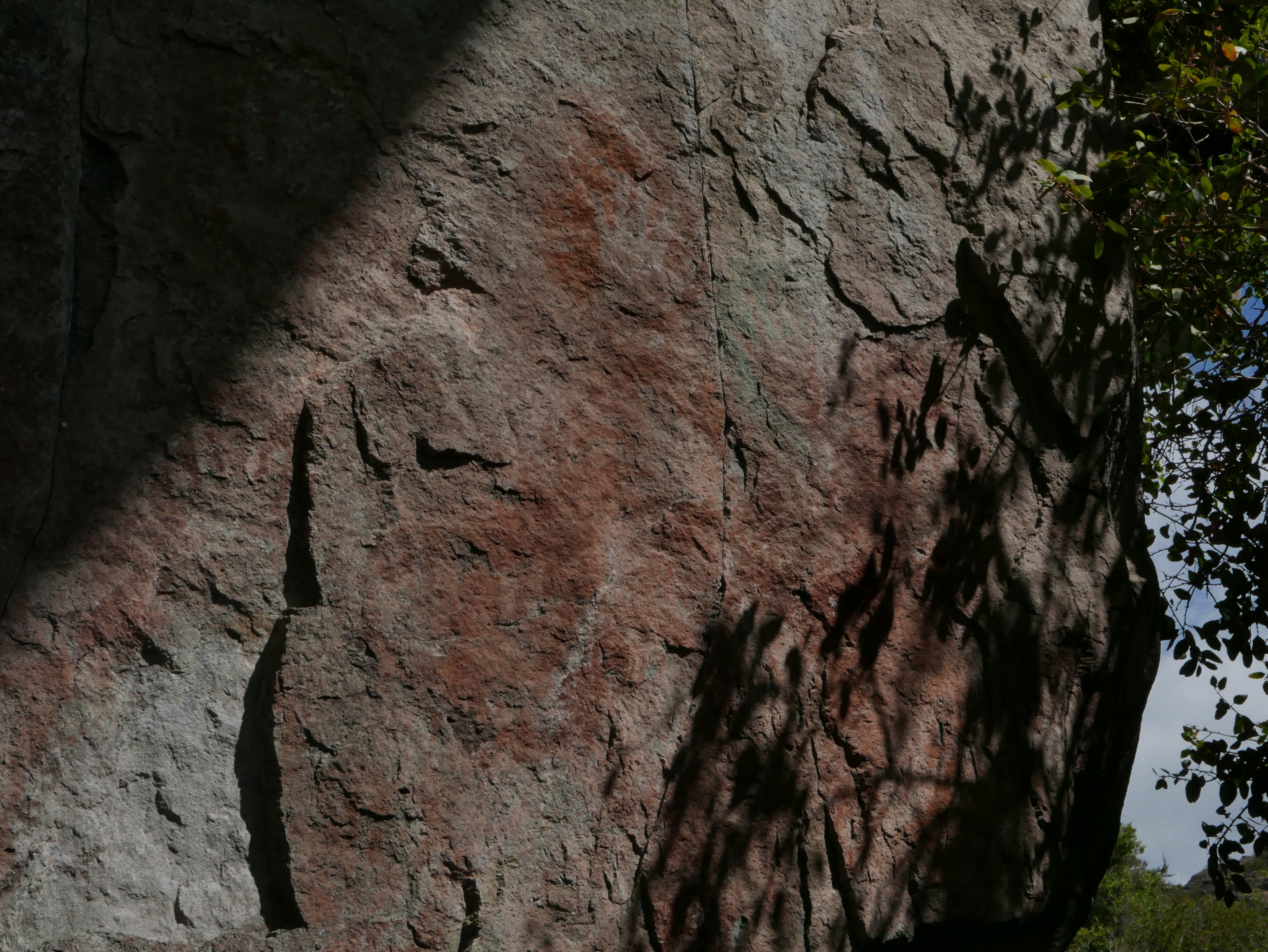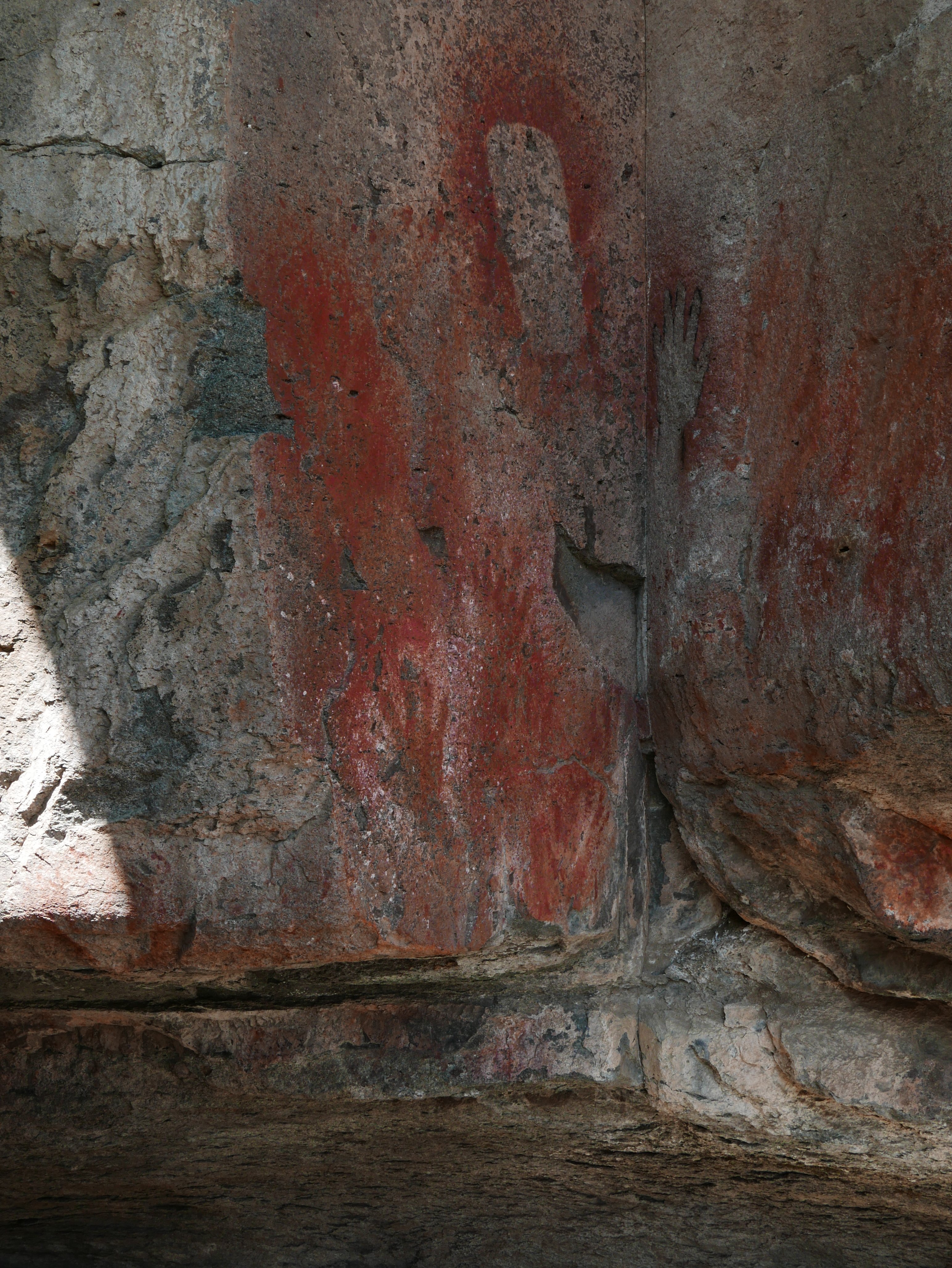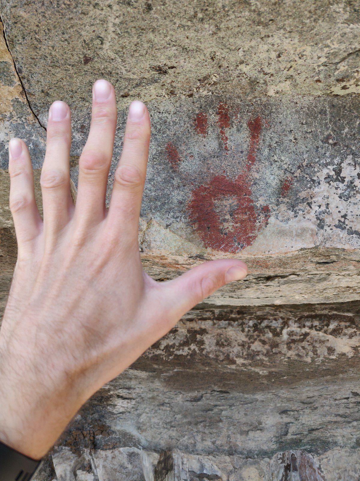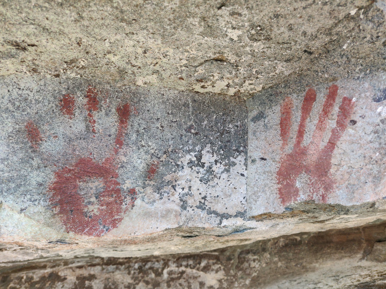 After breakfast we walked down the hill through the village and out the other side, eventually turning left towards the hand painted cliffs. Paying a small entrance fee we strolled up a narrow path through beautiful beech scrub and emerged at the cliff face, which was decorated in multiple red hand prints, both dipped in paint directly and with paint flicked over them to create an outline. Seeing the prints we wondered what the artists must have thought about 12000 years ago, being presumably identical to us other than lacking in technology. Probably worrying about where to sleep that night and where the next meal was coming from, just like cycle tourers!