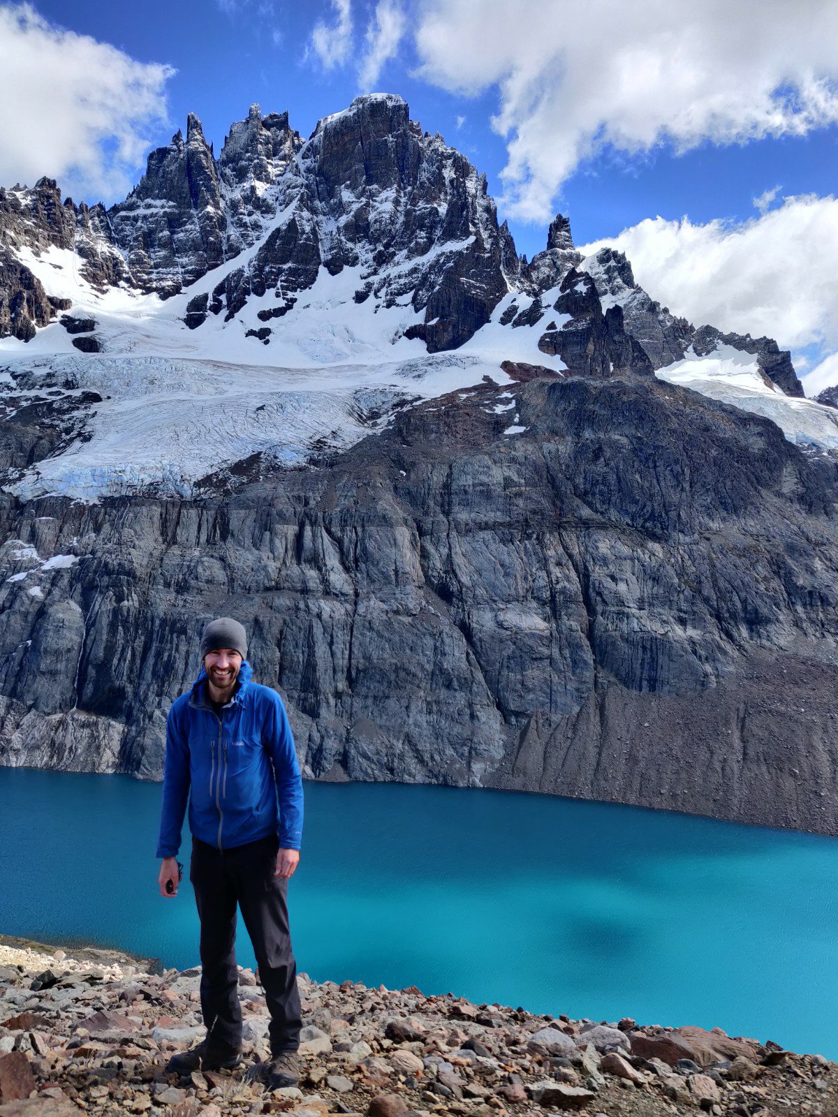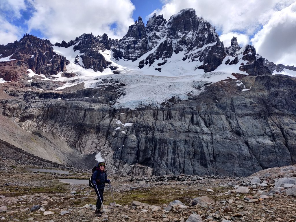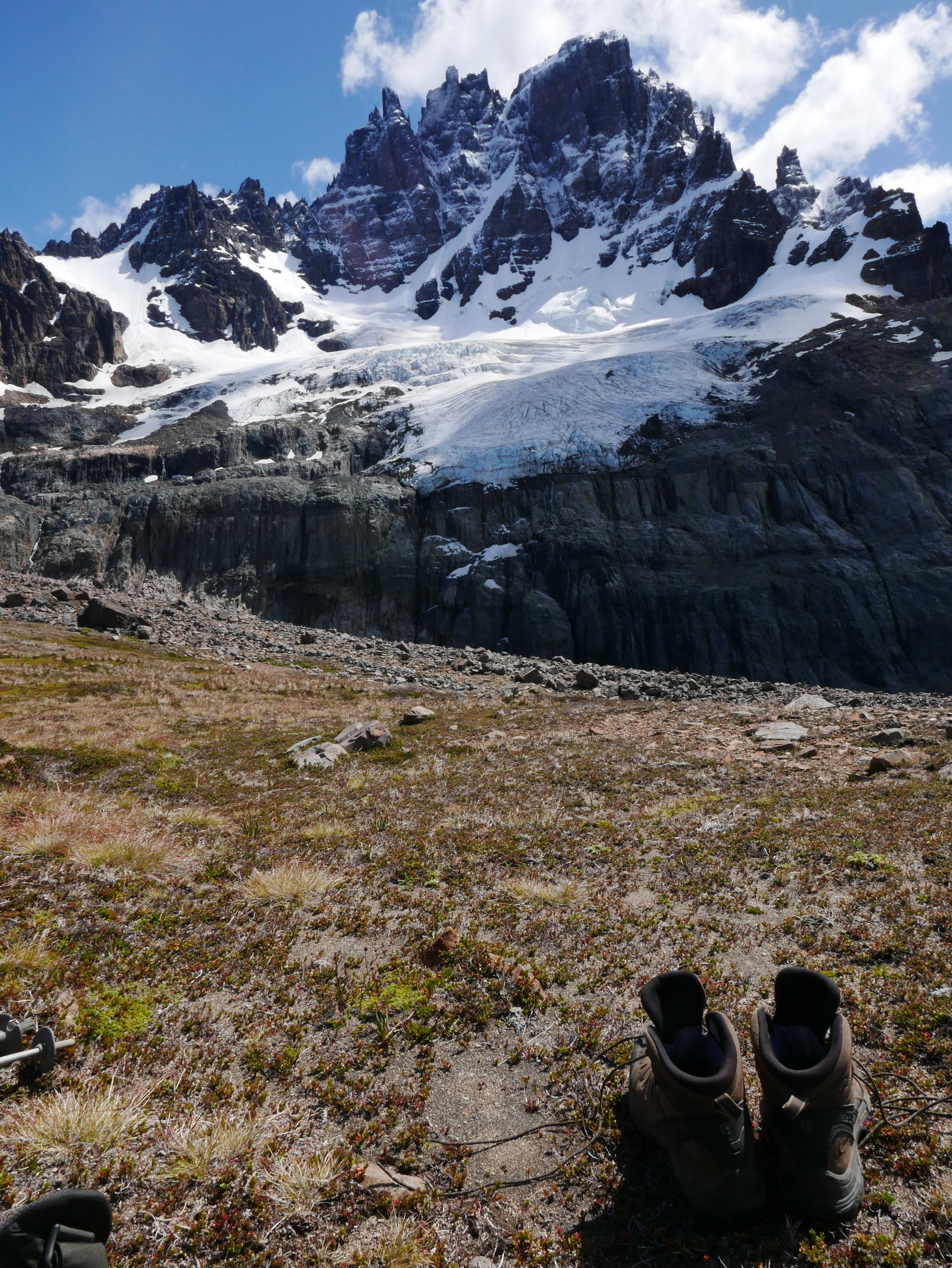 On Sunday we awoke early to clear skies and lighter wind, and hired walking poles from the campsite to take on the Laguna Castillo hike for views of the Cerro. After paying quite a hefty park entrance fee we climbed steadily through nira beech forest, trying to read softly in the hope of spotting a huemul deer as the Americans had done a day earlier. No luck for us as we emerged onto the steeper scrub path and eventually rocky scree, but the views were stunning. We made it to the top in less time than expected and were rewarded with the most incredible view either of us had seen: the snow clad Cerro Castillo peak descending straight down to an aqua marine lake, almost too bright to look at. We tucked in to our first lunch of stock using hot water from our thermos with porridge oats, a surprisingly successful meal, and then had fun with Hannah’s camera before going for a wander around the rim above the lake.