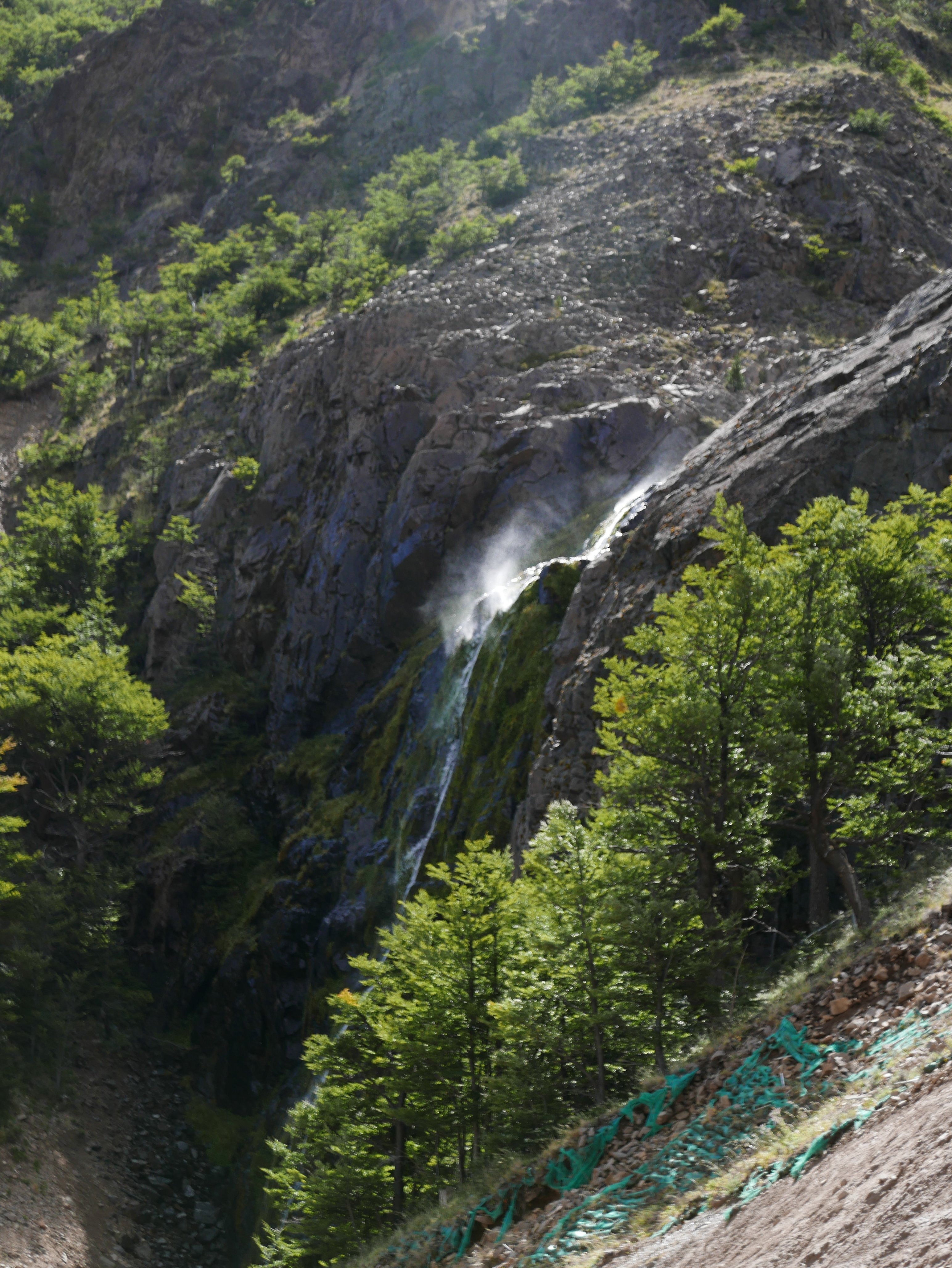 In the afternoon we bore northwest to the headwaters of the Rio Blanco, descending steeply along a tributary into the wind. We passed a waterfall that was being blown spectacularly back upwards in the gusts, which also necessitated cycling quite hard downhill at times. But dumpster before long we turned sharply southwest and into some shelter, albeit with another climb back up another tributary. The volcanic rock cliffs on either side were spectacular, one formed into the silhouette of a human face.