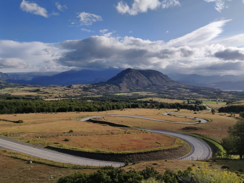At last we reached the plateau top and the highest point on the Carretera Austral, as the sun dipped in and out below the mountain tops to the northwest. Rounding a bend to the south we began a very rapid descent with some occasional bits of unpaved road dangerously appearing with little notice. Now growing tired, it took all our concentration to descend safely whilst being overtaken by the occasional fast car. Rounding a bend halfway down we came upon the famous switchback descent, with several tourists pulled over for photos. Cycling down it was great fun and it was then only a few more km downhill to Cerro Castillo, a stunning ride into the sunset.