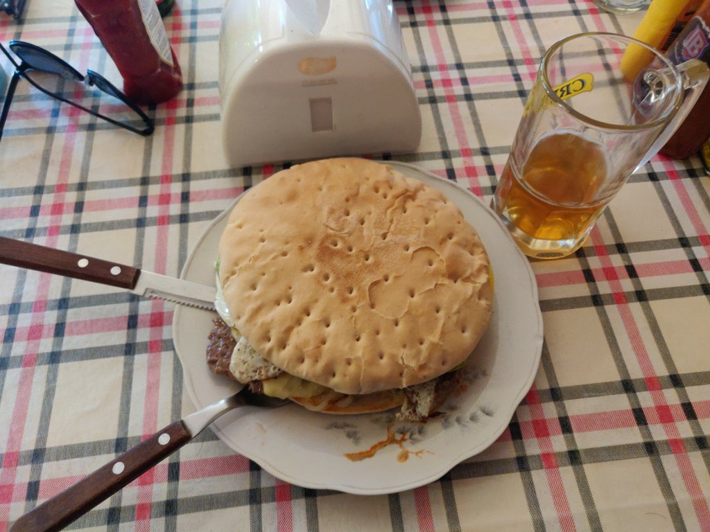 Now hungry for lunch we walked back to town and went to a cafe serving the most enormous sandwiches we’d ever seen, along with a plate of chips and some local beer. Then grocery shopping, including additional oats to try for lunch with stock instead of white bread, and back to the campsite for rest, more food and sleep. We moved our tent to the wind tunnel but as promised by our host, the wind did start to abate in the evening and we got a good night’s sleep.