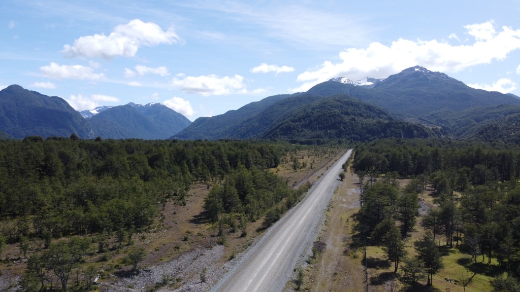 The ride proceeded west gently uphill along dirt road through thick deciduous forest and we made good progress. The roadworks meant lighter traffic and even the resumption of rain didn’t dampen our spirits. We passed a couple of wild camp sites before reaching the hill top after 20km with mountain views ahead. It was 7pm but we still felt good and sailed downhill, into the wind and rain. At the bottom the route turned south and out of the wind as we entered the Rio Murta valley. The rain also stopped and we pushed on along rolling hills and deteriorating ripio.