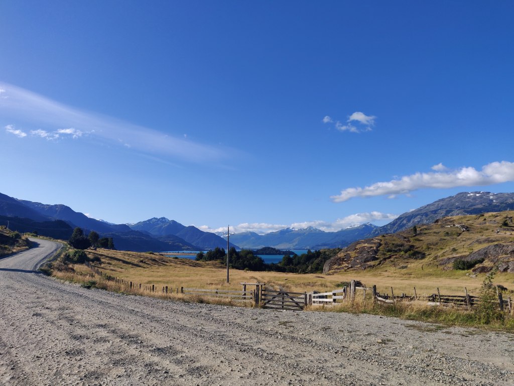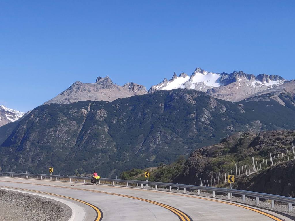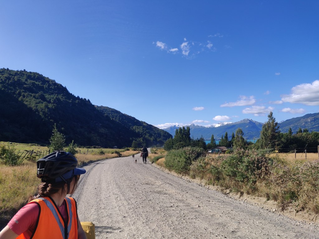 The rest of the afternoon comprised 24km of rolling hills along the western lake shore, with stunning vistas across the water. It was hard going but with plenty of distraction and soon we arrived at the steepest hill, paved with bricks to enable traffic to climb. For us, it was a walking push only, but we were grateful for a solid road underfoot, however short lived. The landscape felt positively Mediterranean as we pootled down into Puerto Rio Tranquilo, a village which just about lived up to its name, other than the myriad tour vendors pedalling boat trips to the famous marble caves. We were in no rush to book these, keen instead to investigate the Exploradores glacier valley, and with the sun disappearing to the west we sought out the Rio Chirifo campsite, which had good reviews on Ioverlander.