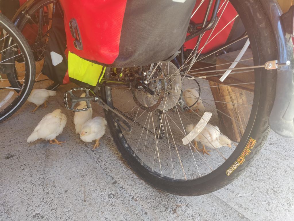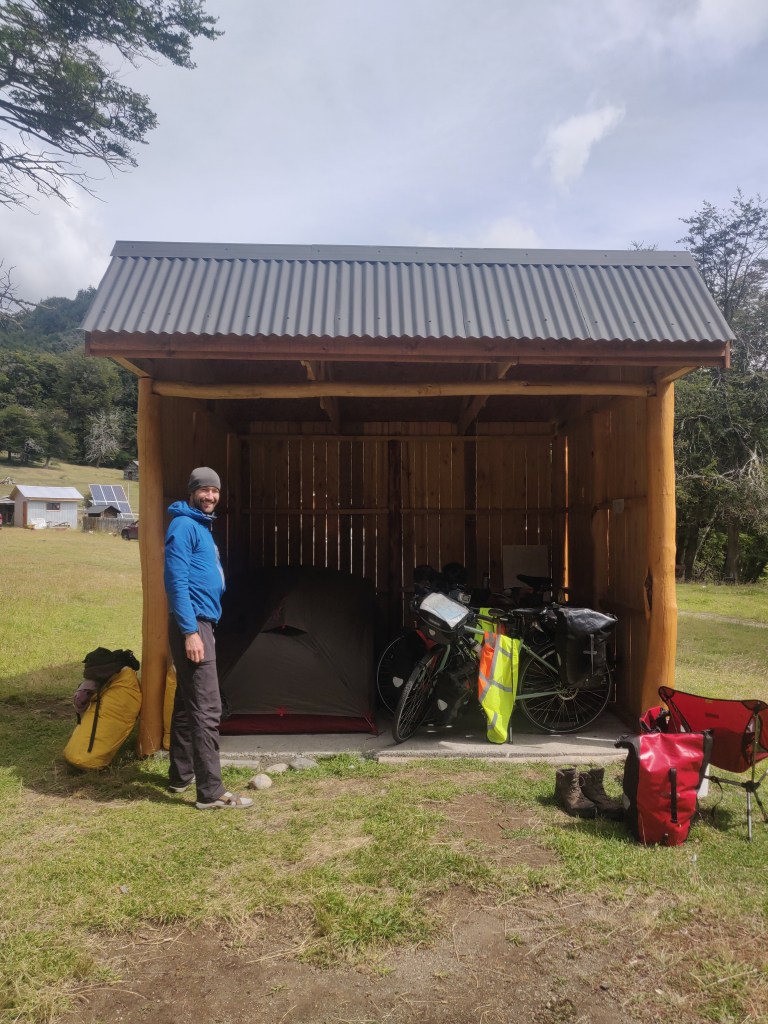 We met the owner who showed us to a wooden camping shelter at the far end of the site and then the toilets and a nice refugio with large open fireplace. After dropping off our bikes and having some food we attempted to ask the owner whether the pickup was his and he might be able to take us through the roadworks tomorrow. He said he had a meeting in Cerro Castillo in the morning but could take us beforehand at 8am for £30. Very relieved, we thanked him and agreed, setting our alarms for 6am. During lunch in our little shelter we were invaded by a hen and her numerous chicks, trying to escape the wind. Before long they were hopping around our panniers, inside both tent porches and jumping up on the picnic bench trying to find food. Whilst very cute to watch we began to worry about hygiene and shooed them away with difficulty. Given the upcoming early start we went for a nap in the tent, after which the chicks reappeared en masse, and once again we were surrounded. Robbie’s impression of a puma did little to scare them away and it took Hannah several minutes chasing and chivvying to send them on their way.