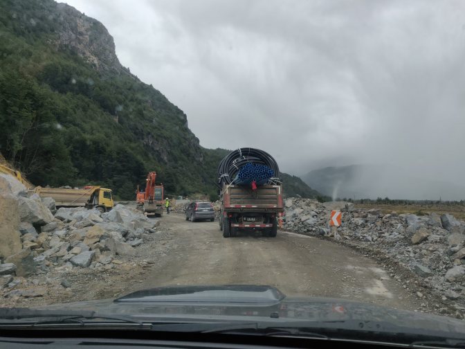 Robbie returned down gloomily, we made our peace with the sacrifice and wheeled our bikes over to the pickup. After a few attempts, we managed to squeeze bicycles and the panniers into the truck and set off to the west with our host driving. Soon we were back on ripio, which deteriorated quickly as we entered the widely braided Rio Ibanez valley. We began climbing after a while, passing the occasional car through a cloud of dust. The road surface deteriorated further as rain began to fall heavily and our driver shrugged and cried “Patagonia” in his deep voice.