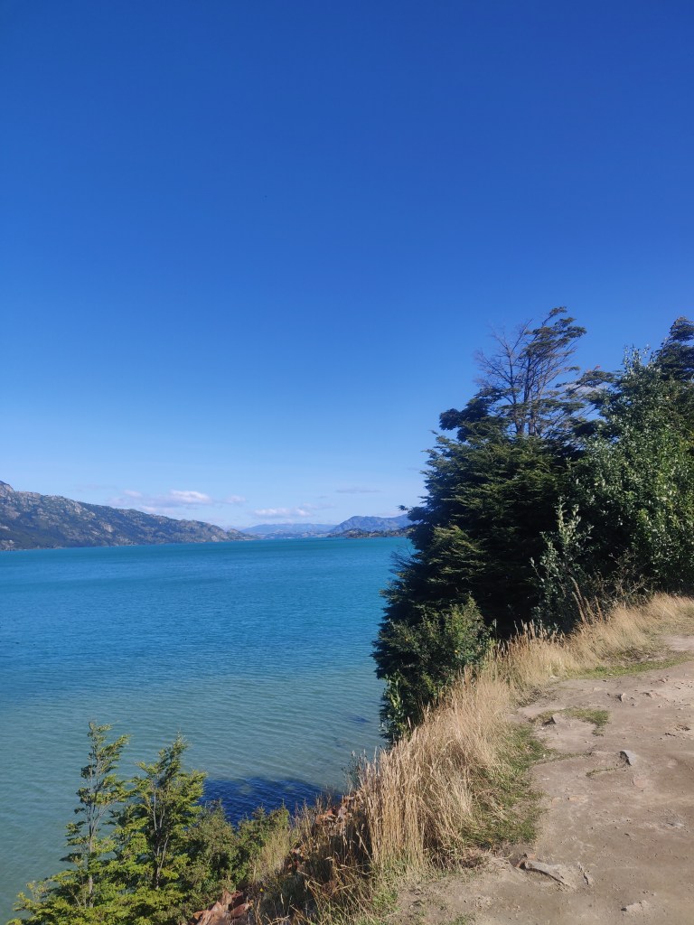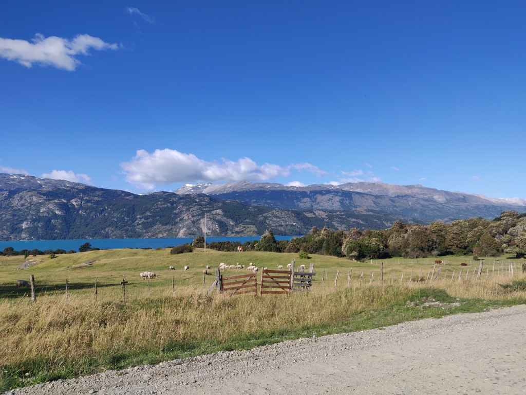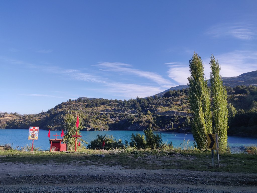 Later in the morning, we cleaned and oiled our bike chains and Robbie took some photos with the drone, which we promised to post on Dona Dora’s Facebook page. We set off around 12 and headed south with a tail wind towards Puerto Rio Tranquilo. Our route continued to follow the Rio Murta initially and we made steady progress on mixed ripio. However the previous day’s good fortune couldn’t last and after an hour Robbie came to a crunching halt with his first flat tyre. A rear one yet again took some time to fix, but the softer replacement tyre made it somewhat easier than before. Job done we trundled on eventually arriving at the confluence of the river with Lago General Carrera. Emerging from a long tree-lined straight with bows forming a tunnel over the road, we caught a glimpse of the lake, an incredibly bright shade of aquamarine stretching off into the distance.