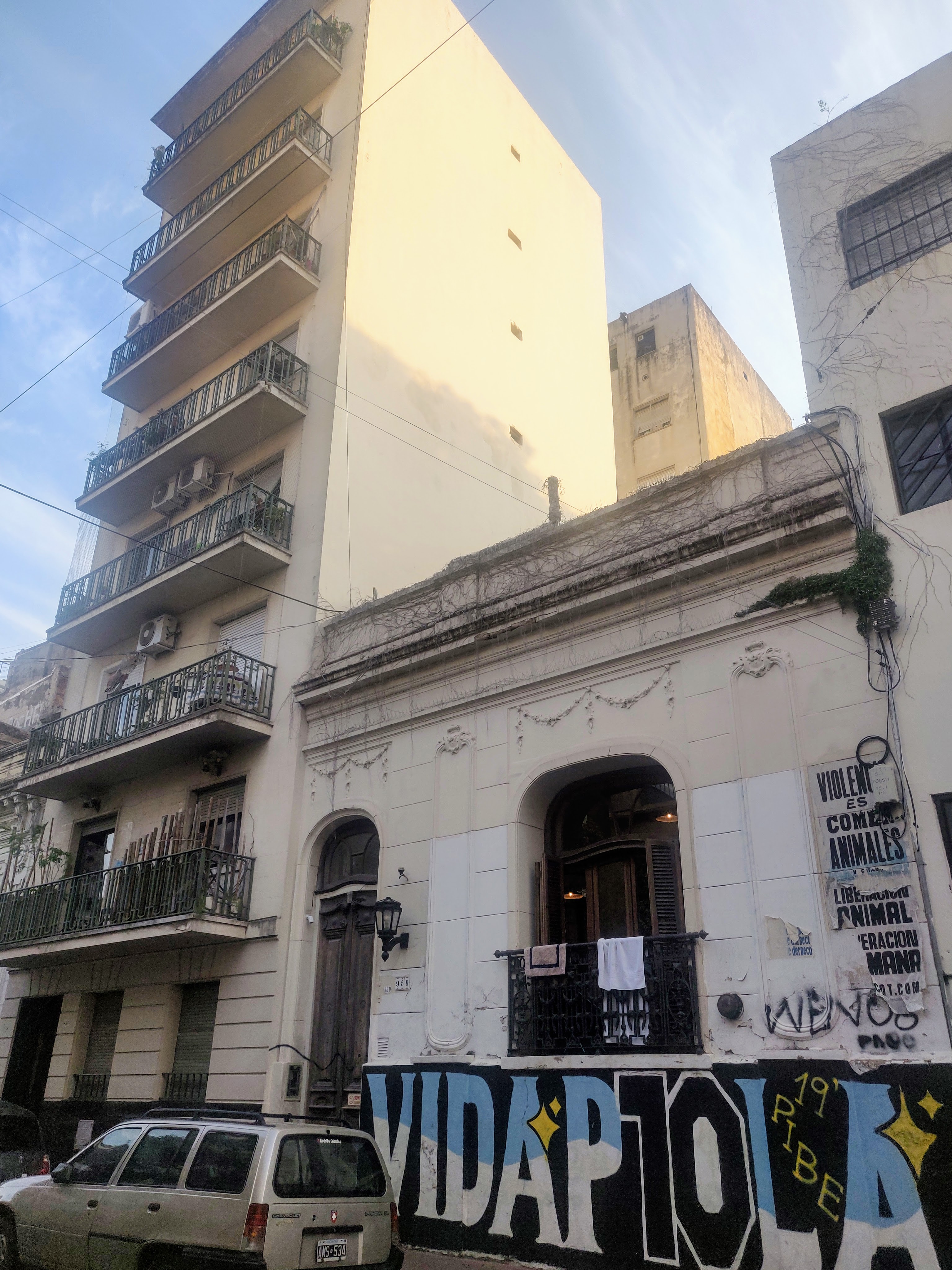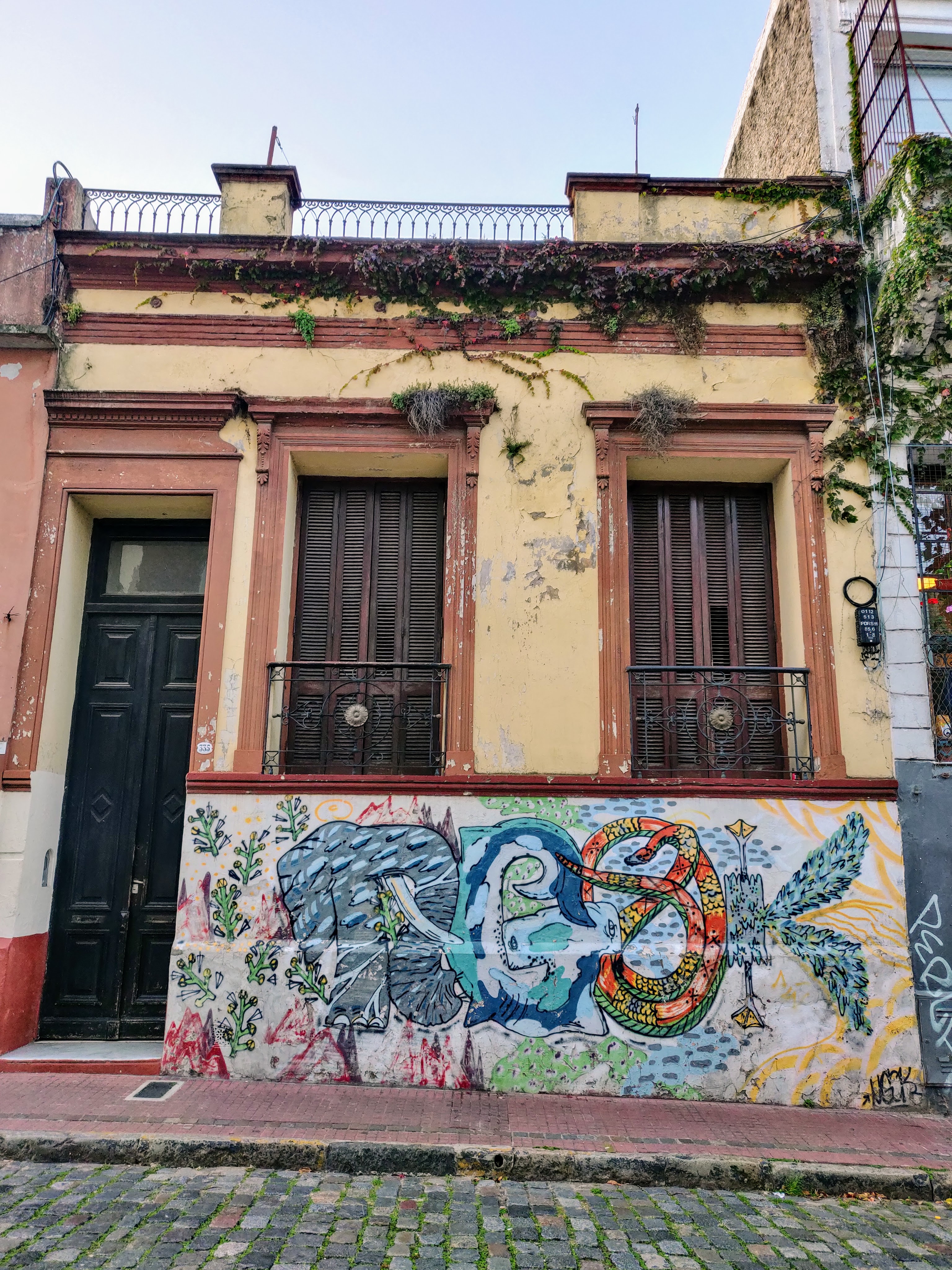 Hannah had found a nice little airbnb with its own entrance off a quiet side street, with a courtyard shared with the owner. It was in fact opposite the vegetarian restaurant that we had first eaten out in during our arrival in Buenos Aires in January, a world away to our present circumstances! Life went into a rather odd routine of checking about how to get home, and trying to spend our time in the city. By this point in BA, you were not allowed to leave the house without a face mask (luckily we had our buffs!), alone, and only to food shops with a 3 block radius of your home. No exercise was allowed and the presence of police officers on a number of street corners deterred trying to stray too far from home. However, armed with our, large, shopping bags we zig zagged our way around, trying to take photos of the interesting district, and its colourful grafitti inconspicuously.