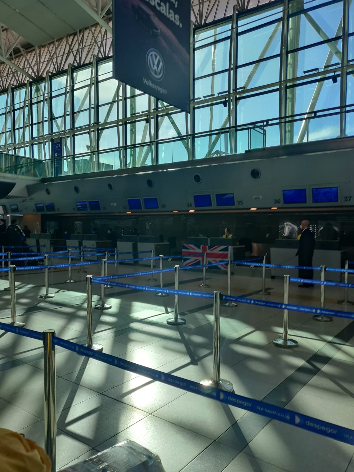 The solo check-in desk (with union jack)