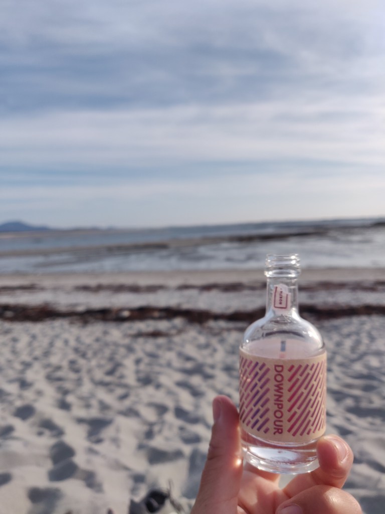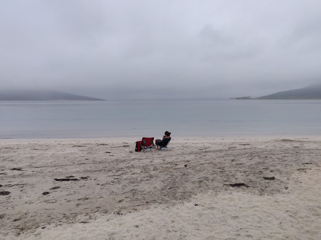 We arrived to a collection of camper vans well spread out along the grassy site overlooking silver sand beaches and aquamarine water. We picked a spot well exposed to counter any possible midges, but needn’t have worried as the freshening breeze blew grey clouds scudding acros the leaden sky. After pitching the tent, some shelter from a van began to look rather appealing, but we went off for a walk and settled ourselves down to cooking tomato sardine pesto pasta with spinach and mushroom, with another Skye Black beer for company.