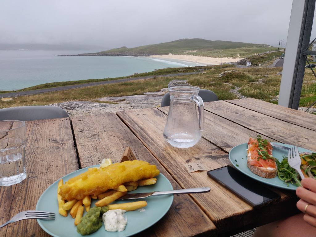 Venturing out at last, we found that sitting right by the seawater edge, we could just about eat breakfast and drink coffee in peace. We packed up efficiently and cycled across the peninsula to the An Traigh cafe bar overlooking Nisabost beach for lunch of sih and chips and local smoked salmon.