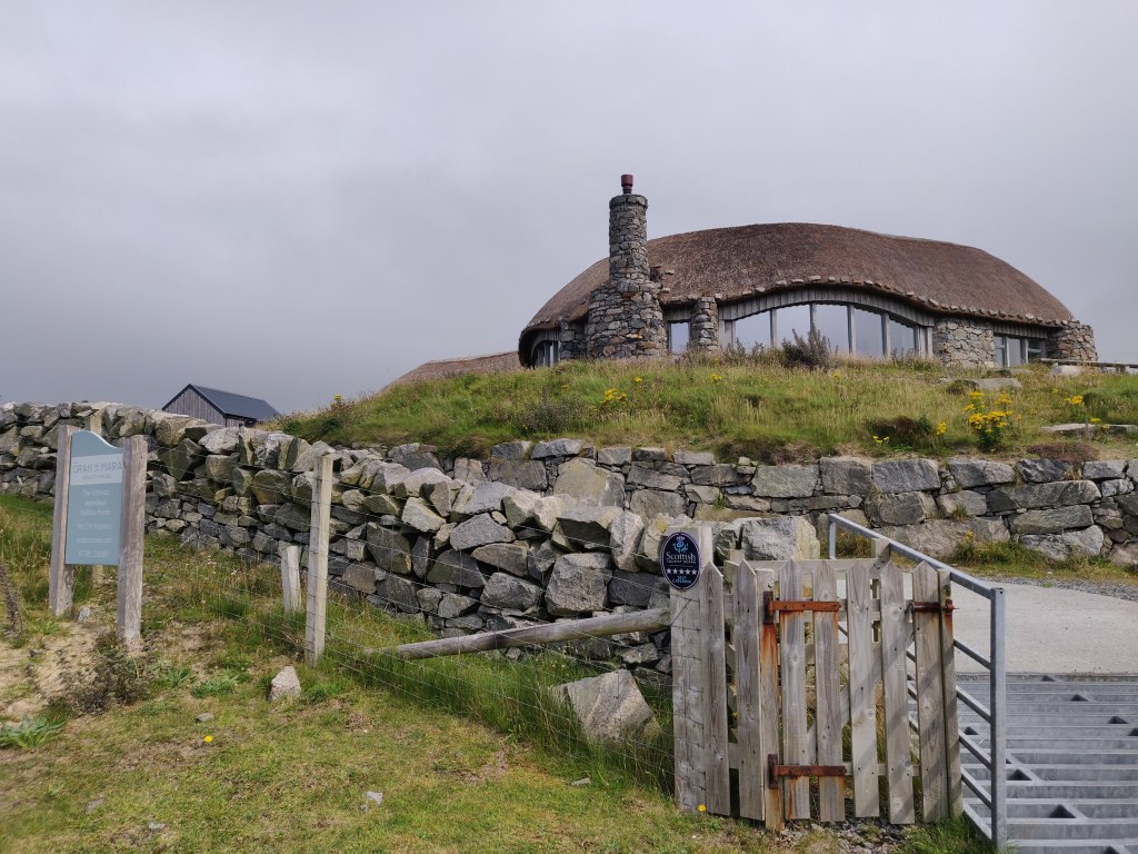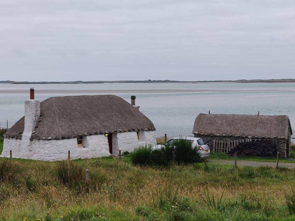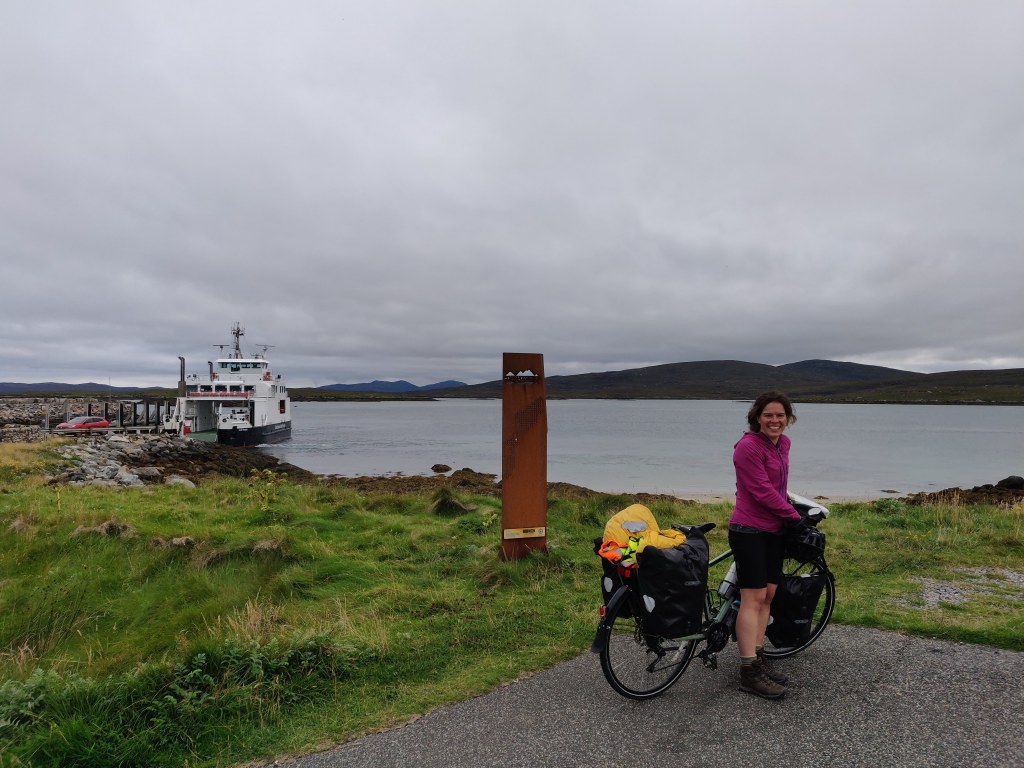 Happily fed, it was a leisurely 16 km ride around the west coast of South Harris to the Berneray ferry at Leverburgh. We passed some modern croft-style stone houses with views out across the Sound of Taransay, but decided none of them could match the Horgabost campsite.
