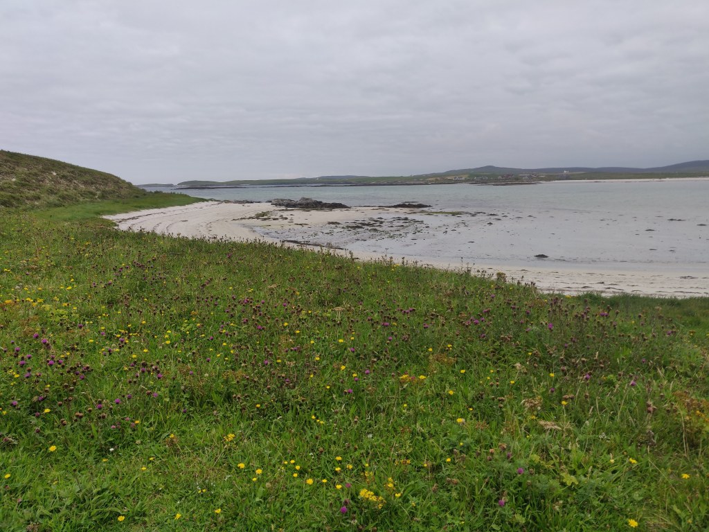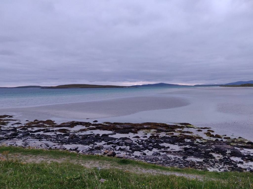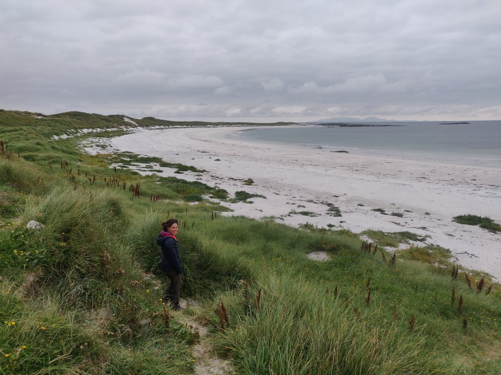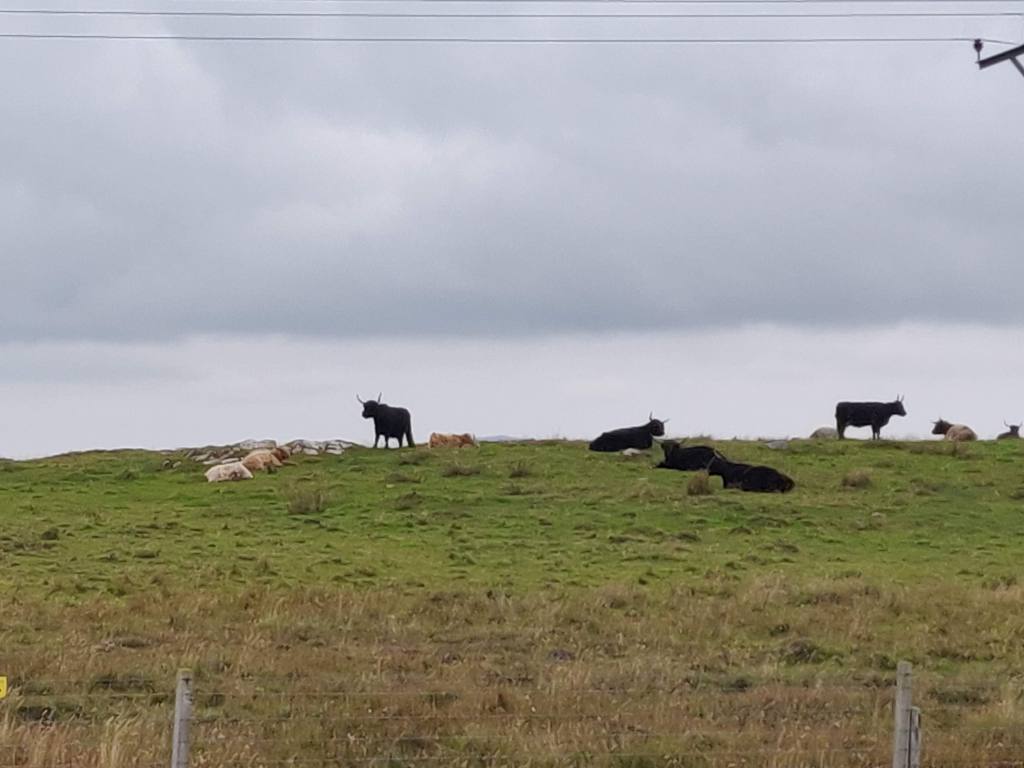 We continued west past Vassay island, its historical remains accessible on foot at low tide, and skirting Ben Scolpaig. Sadly the Wee Cottage Kitchen food van was closed on the Sunday, but views of beautiful crofts and black highland cows kept our spirits up as we turned south. We turned off the main road at 1pm and found our way to the west coast, whist sand beaches and the Balranald Nature Reserve.