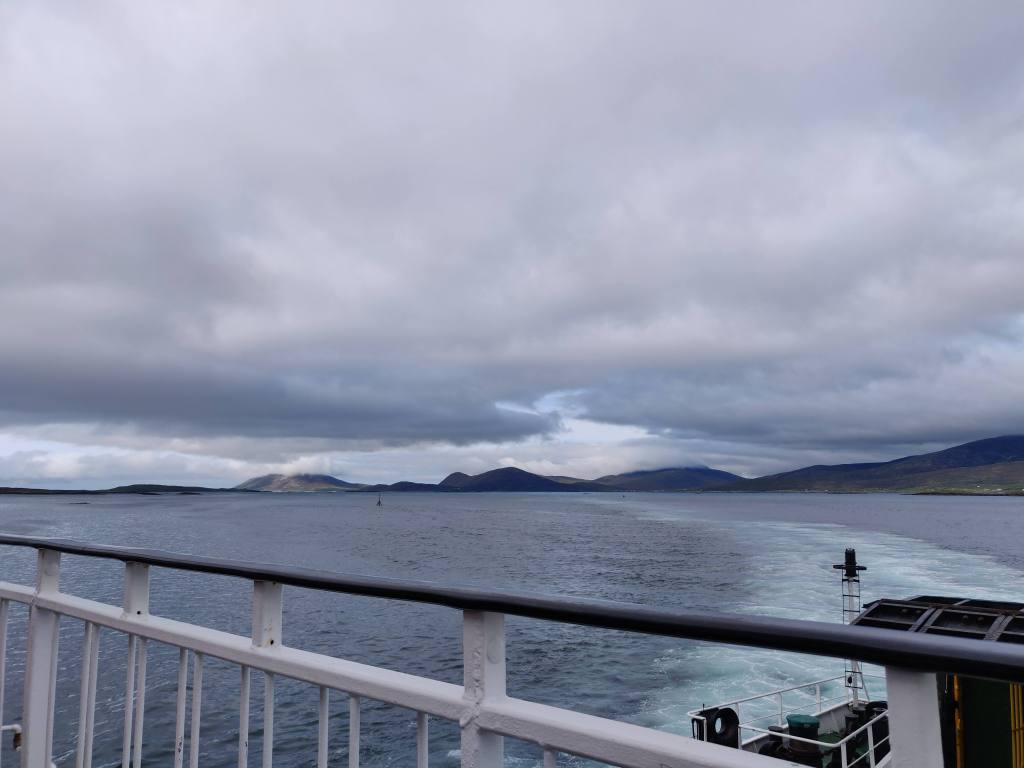 The low cloud clung to the hills all around us, but with glimmers of blue sky in between, the wind freshening from the northeast. We turned gradually south past the Toe Head peninsula and then southeast up and over a small hill and down to Loch Steisebhat. We stopped for some provisions at the Harris community shop, and then turned off the A859 to the ferry point. The Anchorage restaurant here provided a source of chocolate brownie as we waited.