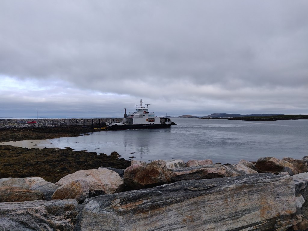 We were last onto the ferry from Leverburgh, jogging down the ramp not to be left behind. The route to Berneray started with us heading south, past red and green lateral buoys, and coming close enough to small islands on either side that it felt we must surely touch. Eventually we turned west and touched into the Berneray ferry terminal, another steep slipway, sheltered by a breakwater to the east, a causeway to the west and the isle of Berneray to the north. We cycled 300m north initially to browse the Bernerary shop and then headed south and west across the causeway to North Uist.