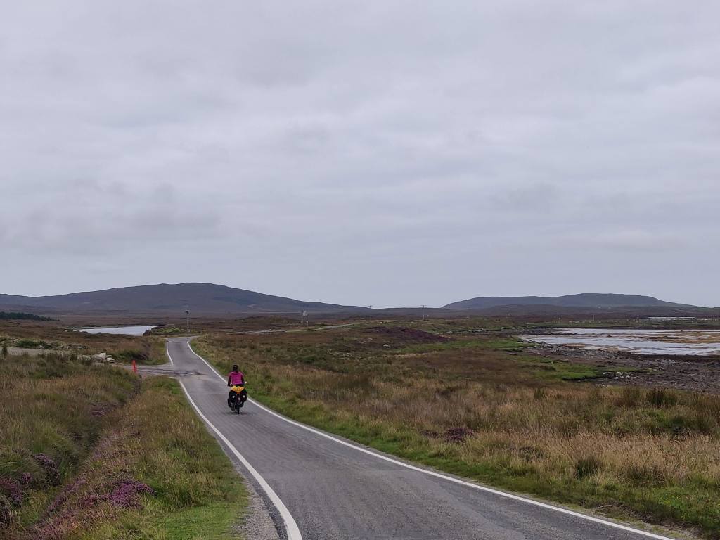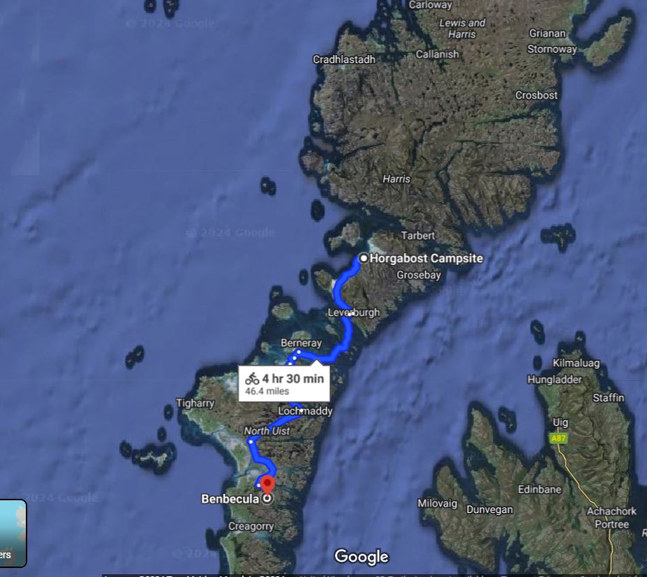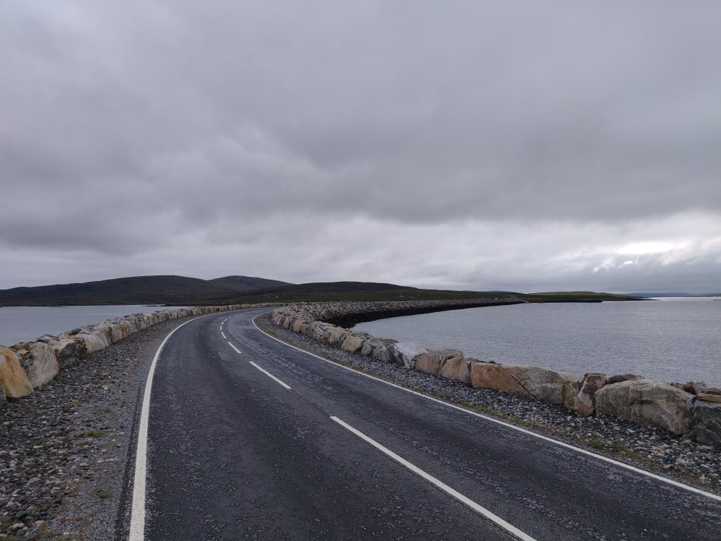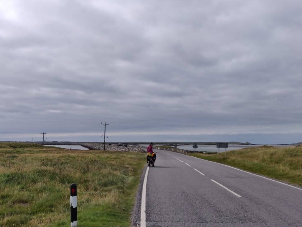The A865 passed uneventfully, with a brisk crosswind but with no more than a 25m hill to overcome, the landscape roughly 50% water on the left and tidal flats on the right. After lunch, we turned south and then southwest for the string of causeways over to Benbecula, touching briefly on the island of Grimsay.