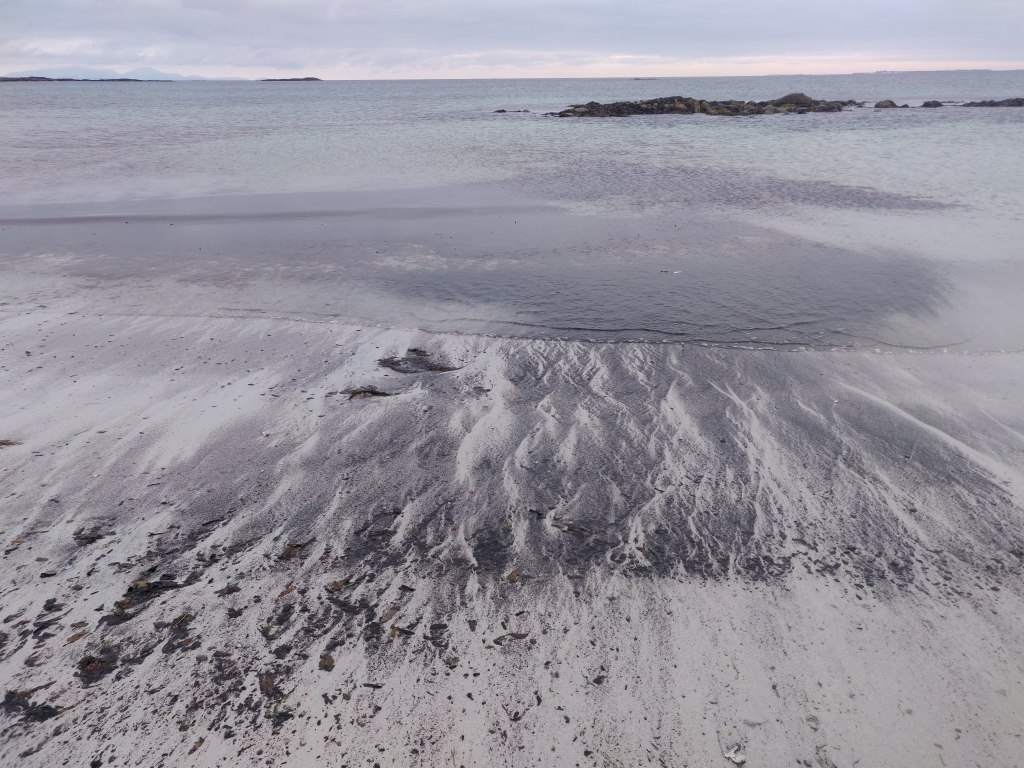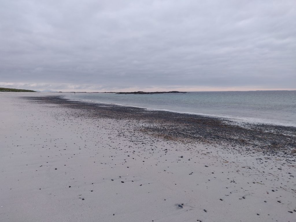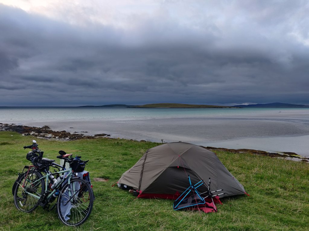 It was an easy cycle over the causeway, passing signs for otters crossing, but not seeing any. And then a gentle half hour ride along mostly flat terrain down the B893. We soon arrived at the turn off for Clachan Sands, heading 500m northwest back to the coast and an informal camping site, with honesty box and freshwater tap.