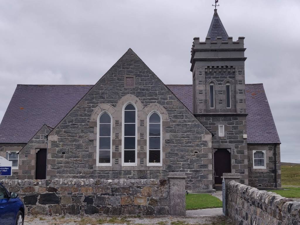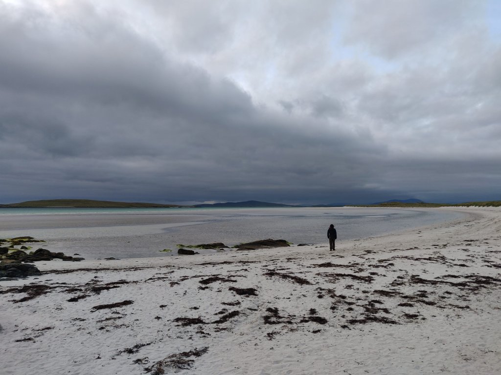 Sunday morning dawned cloudy but dry, and with lighter winds, few birds or people to disturb, Robbie took a chance to fly the drone, wholst Hannah went for a walk on the beach. We were soon on our way, heading southwest briefly before turning west onto the A865. Traffic was very light as we rejoined the broken north coast of North Uist, touching inlets at regular intervals.