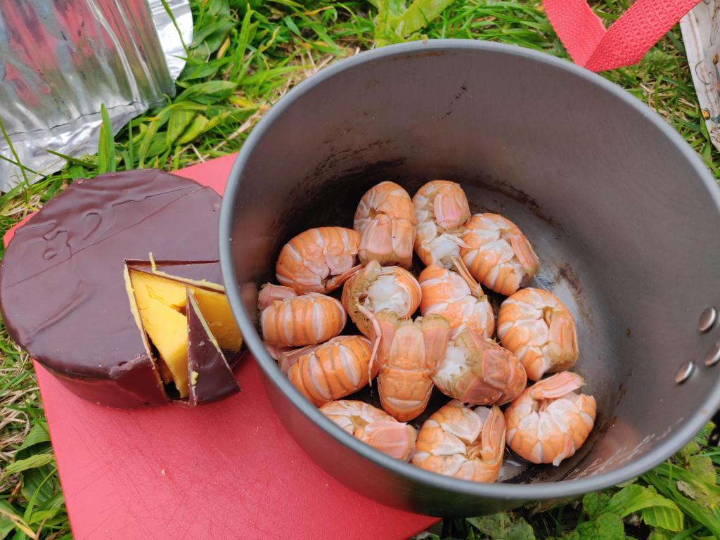 20 minutes later we were at the campsite of the same name, where an enthusiastic owner checked us in – offering us 2 pitches, one of which available for one night and the other two, slightly further away. We opted for the latter just in case, and also bought some local shrimp from him for lunch. Heated up on the stove, we munched through them merrily with cheese and oatcakes before pitching up the tent.