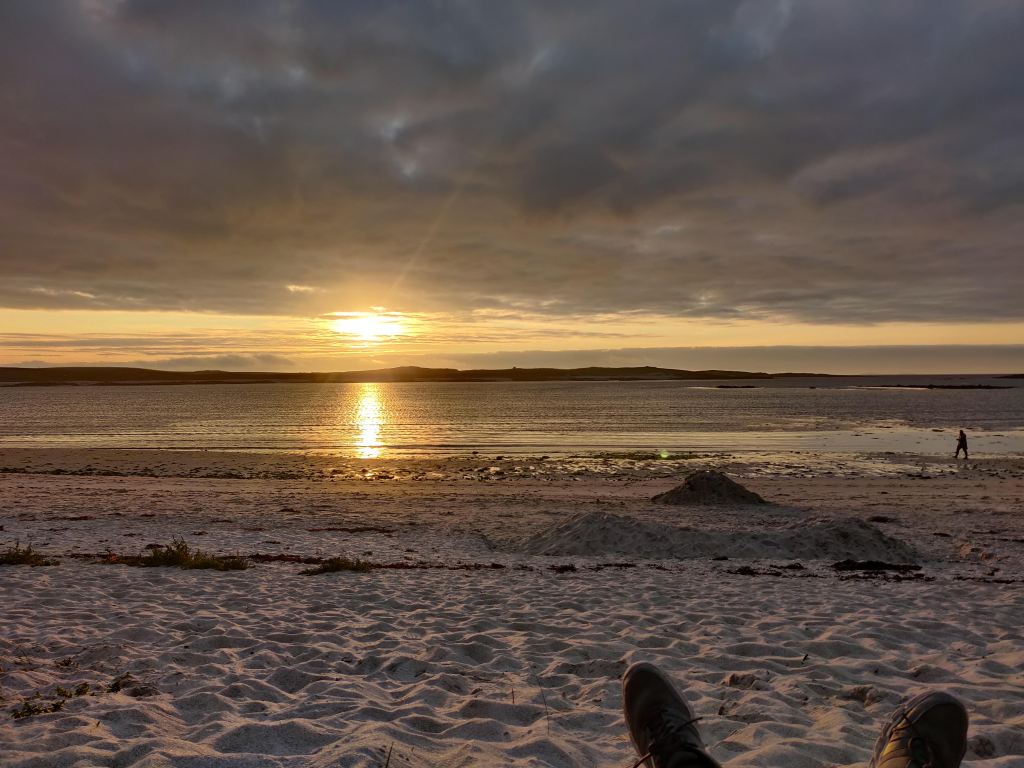 At 5pm we arrived at the Otter Edge campsite and pitched up in a large field backing onto sand dunes. The owner’s daughter is a keen wildlife photographer and told us of several otter families on the beach nearby. We took a bottle of beer round to the beach, and sat down against the machair dunes to enjoy it, completely forgetting a bottle opener. Hannah nobly returned to the tent to fetch one and soon we were relaxing in the evening sun.