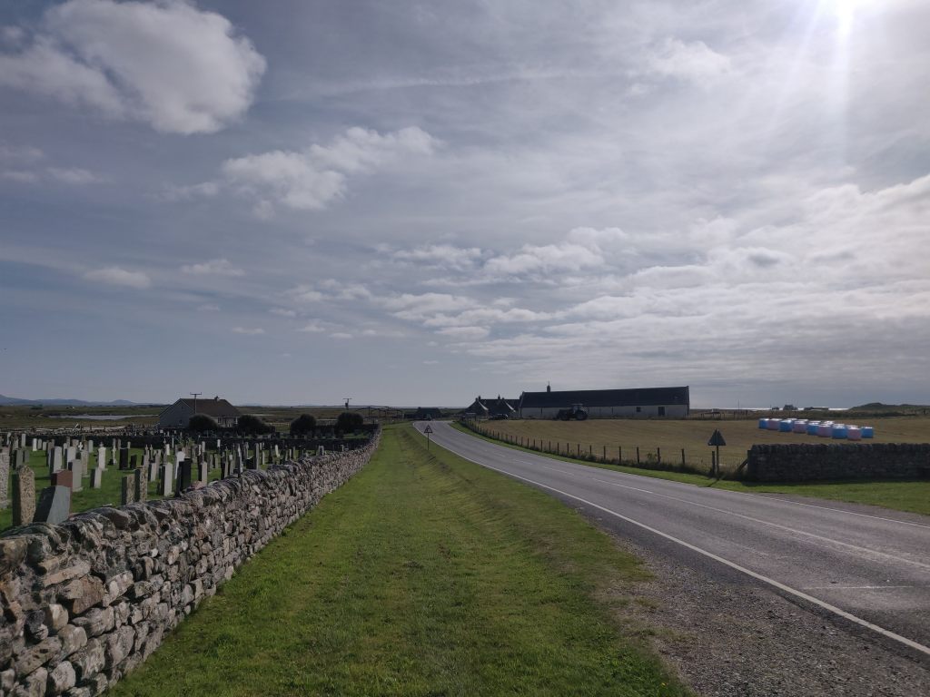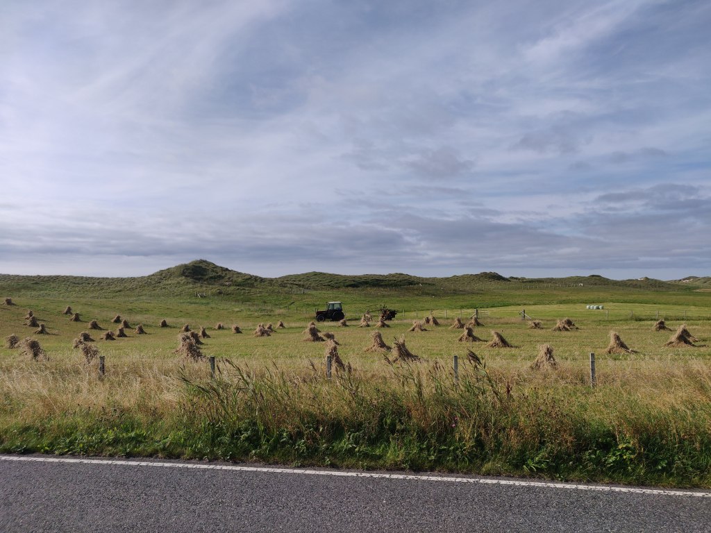Leaving the military town behind us we turned sharply south and came across the Baile Nan Cailleach burial ground, a medieval graveyard and chapel. The sun out, we continued south, touching the coast once more and passing fields with old traditional hay stacks being piled up by little old tractors.